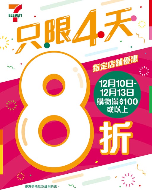 優惠有效期由2025年12月10日早上7時至12月13日,適用於指定香港店舖,並不適用於網購及7-Eleven手機應用程式。部分貨品只限於指定店舖提供,貨品數量有限,售完即止。