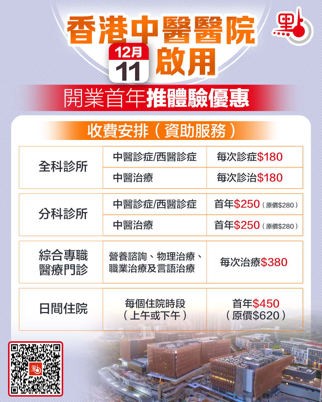 香港中醫醫院位於將軍澳百勝角路1號,今起分階段投入服務,首年提供門診、日間住院及臨床支援服務,第二年起開展住院服務,預計2030年底全面啟用400張病床,門診量達每年40萬人次。