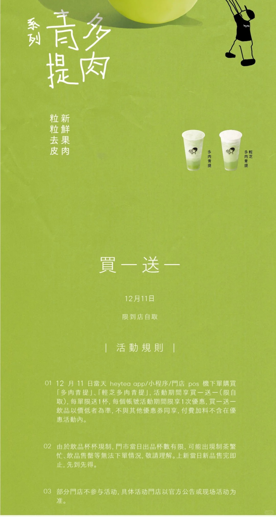 【點新聞報道】茶飲品牌喜茶(Heytea)宣布昔日的人氣銷量王多肉青提系列12月11日正式回歸,為了慶祝這款「果茶天花板」重出江湖,喜茶更突發推出今日1日限定買一送一優惠。