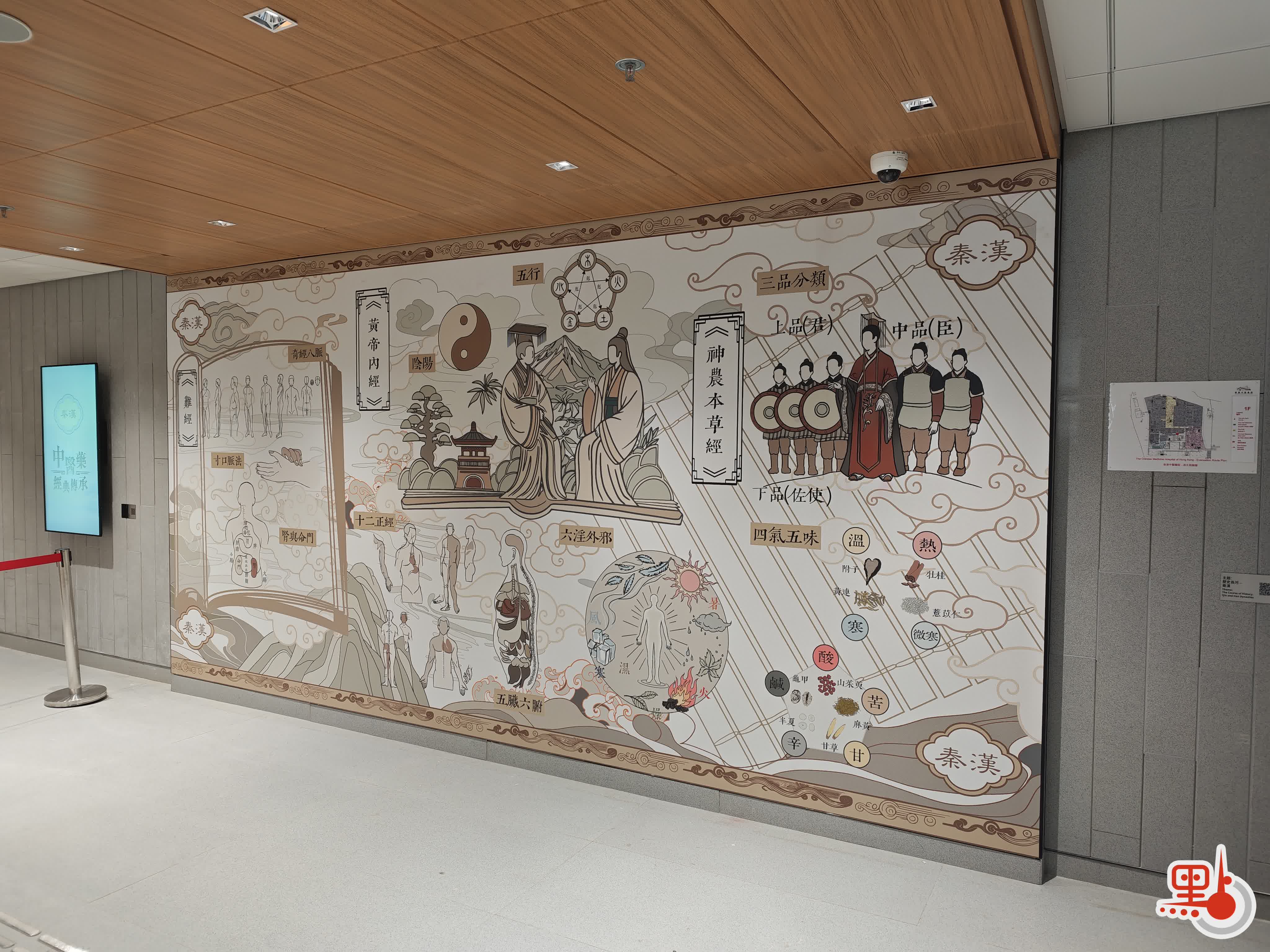 醫院的設計還融入了大量的傳統文化元素。首先,在醫院大堂及不同樓層中,均設有不同壁畫展示中國傳統中醫歷史和文化。其次,在院外花園,亦以傳統文化進行了多樣雕塑設計,包括用中藥形象製作的「中藥象棋」和蘊含木火土金水元素的「五行相生花園」。