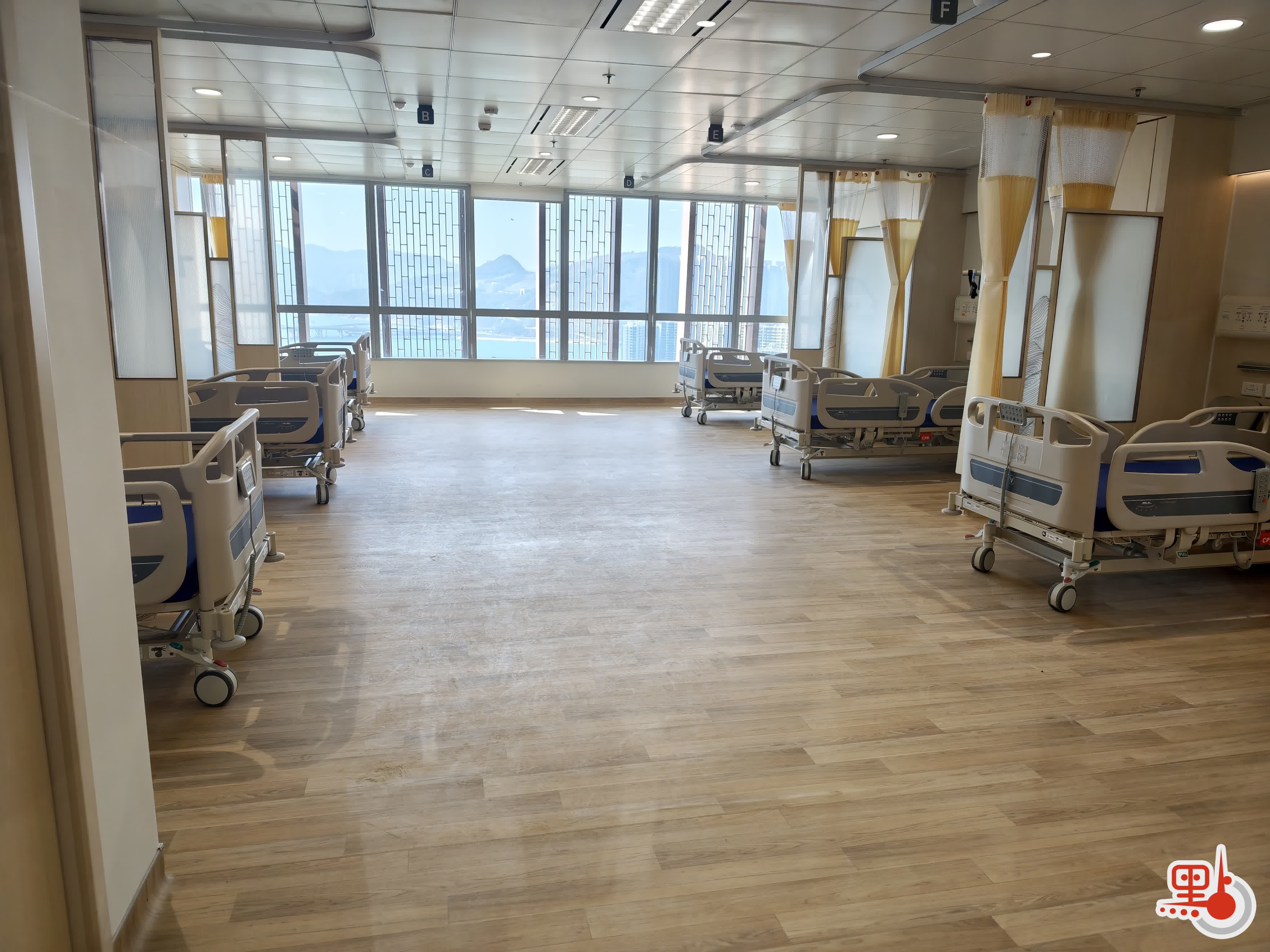 醫院日間住院部門在首年共設25張病床,服務分為上、下午兩個時段,每個時段共4小時。記者參觀了其中的6人間,房間內空間極大,木質地板、設計典雅、配置齊全,窗外便是將軍澳海景,整體風格如同酒店套房。