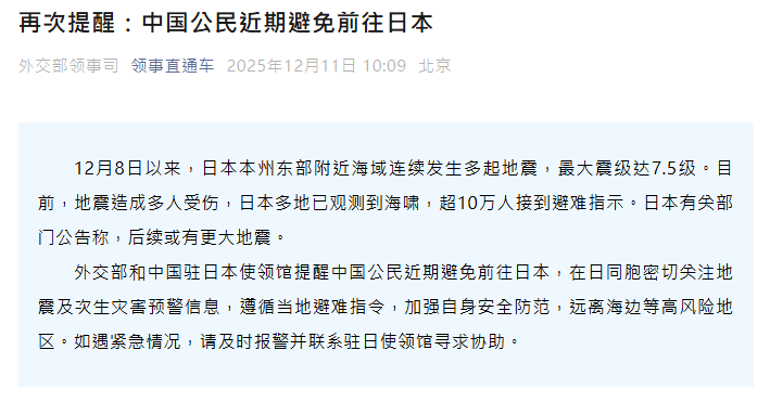 【點新聞報道】外交部領事司11日消息,12月8日以來,日本本州東部附近海域連續發生多起地震,最大震級達7.5級。目前,地震造成多人受傷,日本多地已觀測到海嘯,超10萬人接到避難指示。日本有關部門公告稱,後續或有更大地震。