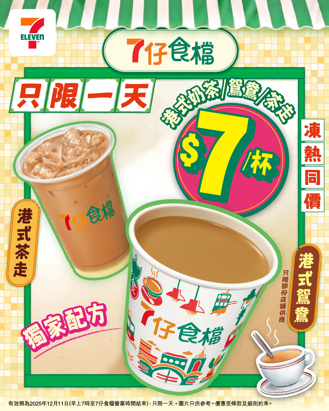 【點新聞報道】7仔食檔一日限定優惠,今日(11日)只需$7就可以飲到一杯香濃滑口的地道港式奶茶/茶走/鴛鴦,凍熱同價。