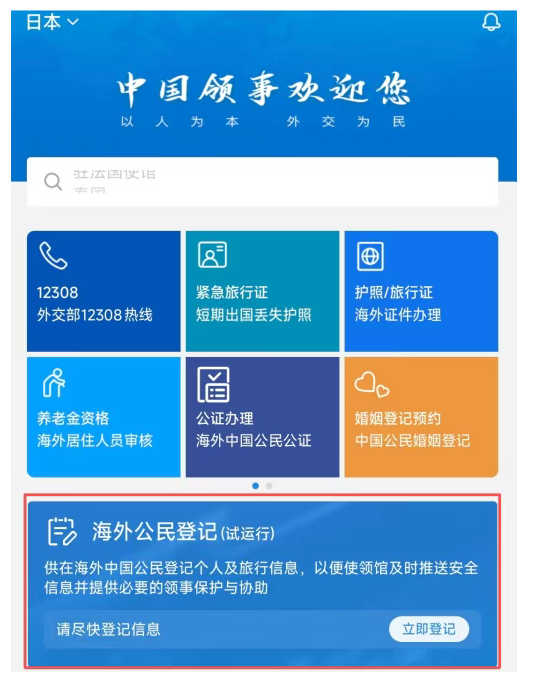 為有效保護在日中國公民人身安全,進一步幫助在日中國公民更好獲得領事保護與服務,外交部「中國領事」APP推出「海外公民登記」功能模塊並已全面上線。中國駐日本大使館提醒在日中國公民: