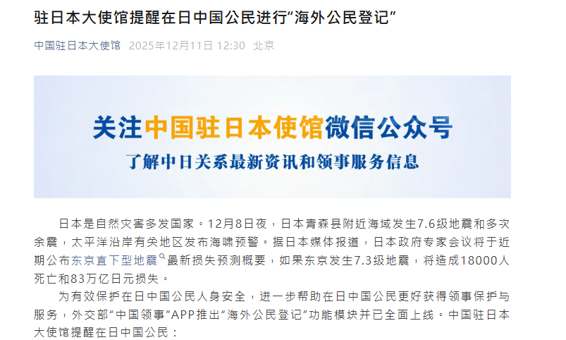 日本強震|我駐日使館提醒在日中國公民進行「海外公民登記」(附流程)
