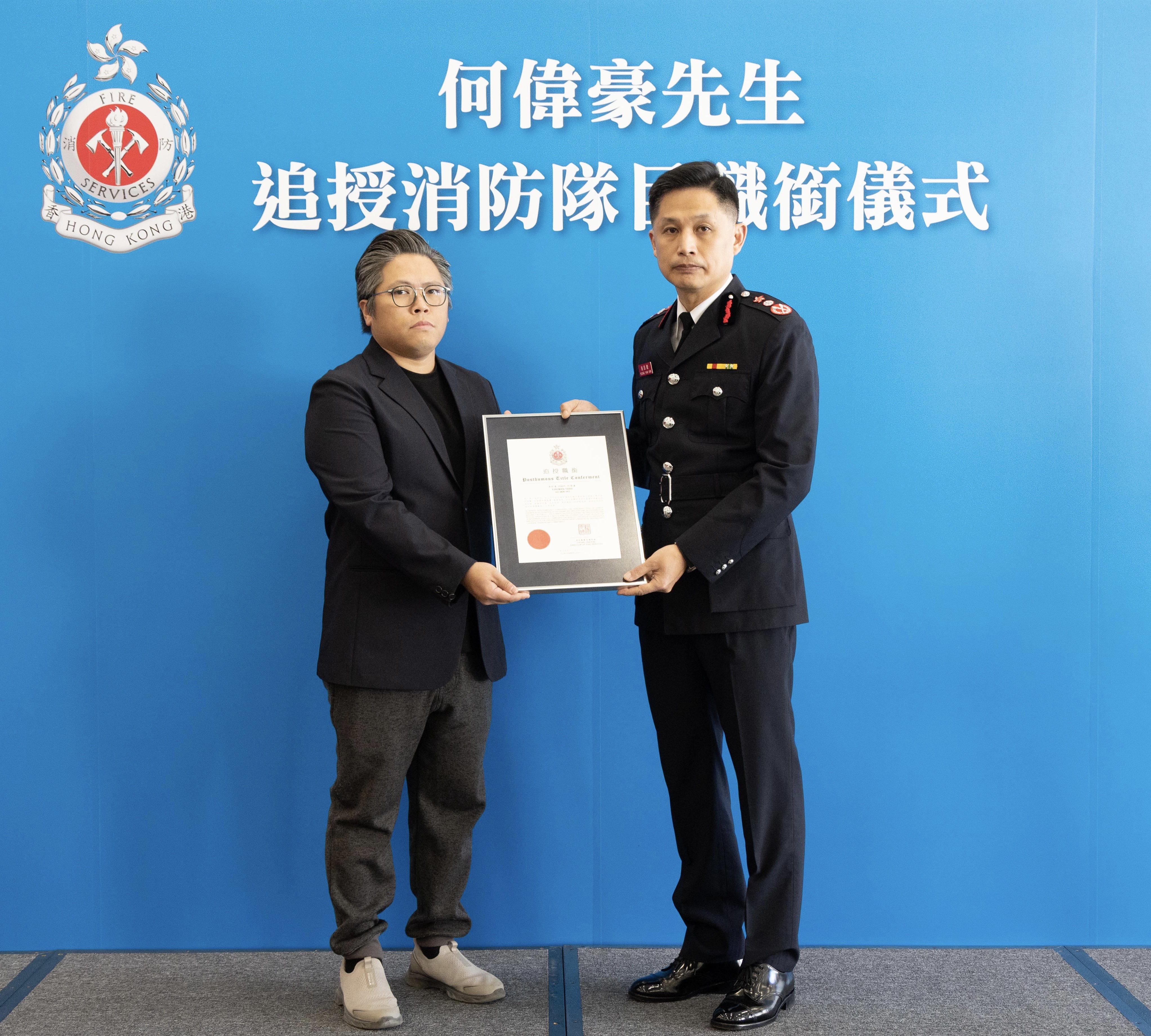 【點新聞報道】消防處今日(11日)向已故屬員何偉豪追授消防隊目榮譽職銜,以表揚他在執行滅火救援工作期間堪稱典範的服務及無私的精神。追授儀式於沙田消防局舉行,消防處處長楊恩健向何偉豪頒授追授函件及消防隊目階級章刺繡,由何偉豪家人代表接受,新界北總區的屬員亦在場見證。