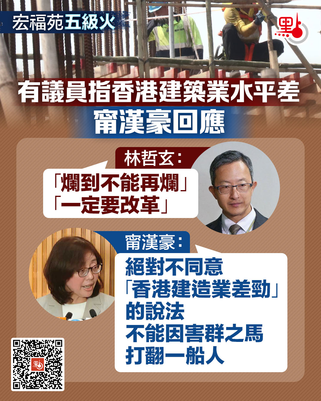 對於有傳媒提及立法會議員林哲玄質疑香港建築業水平不佳的評論,甯漢豪回應指,若以文件做假的個案來說,各行各業都有。今次火災事件讓大家看到,不同制度有需要改善的地方,但她絕對不同意「香港建造業差勁」的說法。