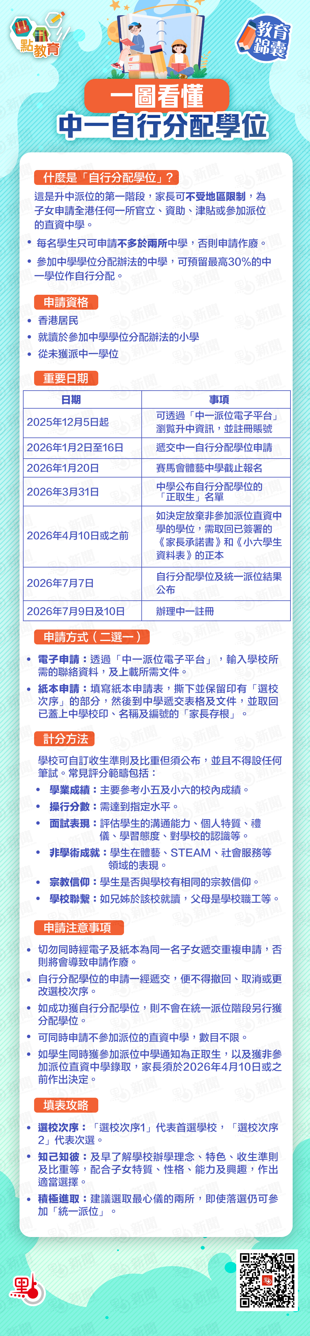 【點新聞報道】參加應屆中一派位的小六家長請注意!2026年1月2日至16日是「自行分配學位」申請期,該階段不受校網限制,是子女入讀心儀中學的黃金機會!點新聞現整理升中懶人包,助您輕鬆準備!