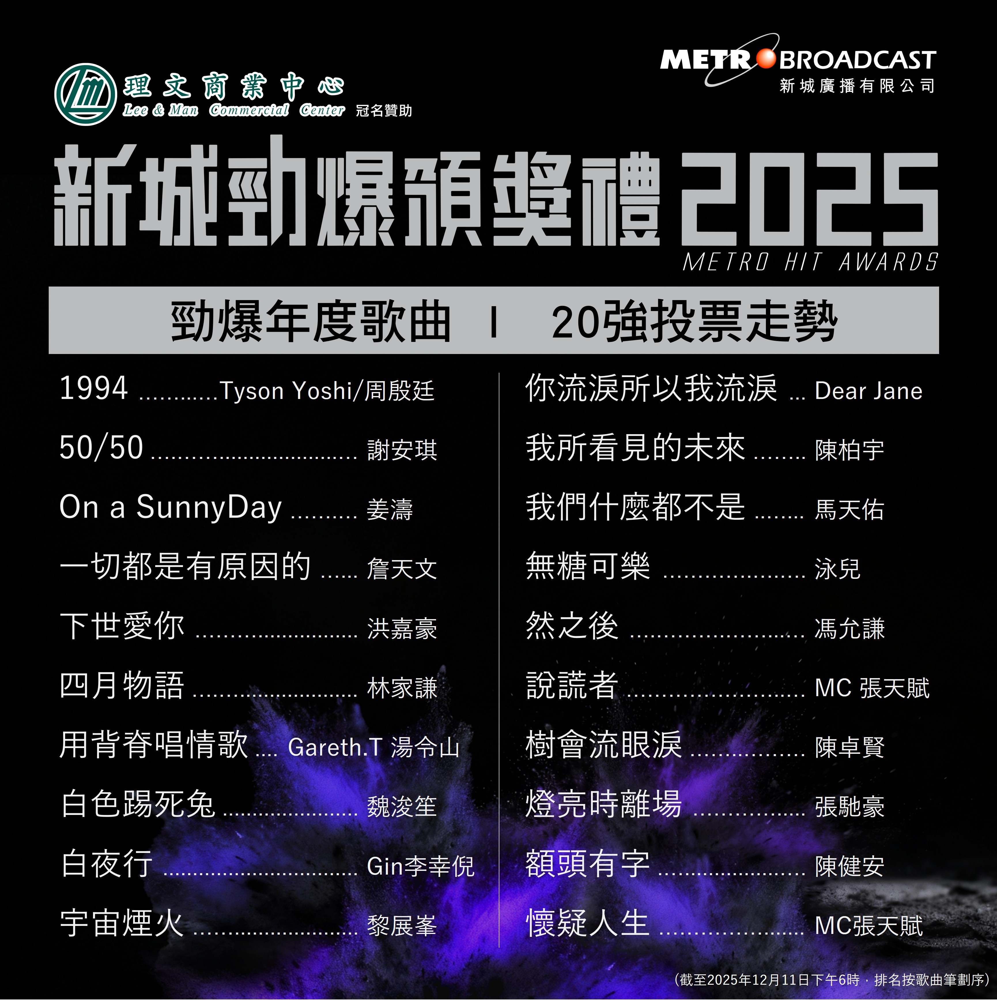【點新聞報道】《新城勁爆頒獎禮2025》將於本月27日假香港會展中心舉行。隨着公眾投票進入白熱化階段,大會昨日(11日)下午6時公布「勁爆年度歌曲」二十強最新投票走勢。