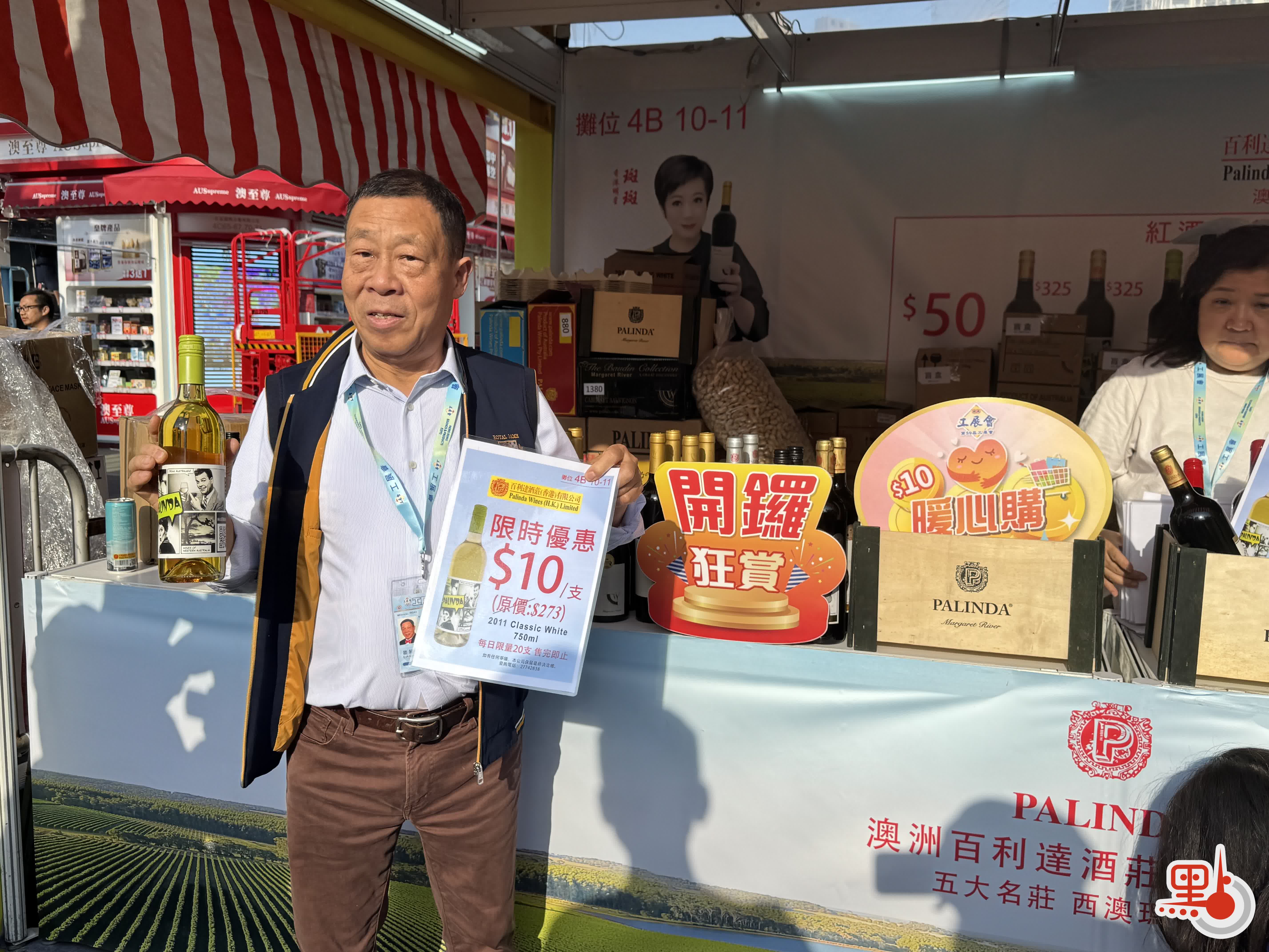 百利達酒莊負責人黃先生表示,今年是第3次參加工展會,其宣傳做得很好,所以相信今年會有更多人來消費。以往年經驗來看,夜晚會有較多人購買酒品,在一旁的「Chill Bar」搭配美食品嘗。該攤位參與10蚊暖心購,提供10港元購原價308港元的百利達白金甜白葡萄酒一支,每日限量20支;還推出百利達幸運盲盒,50港元最高可抽到價值1648港元的葡萄酒。