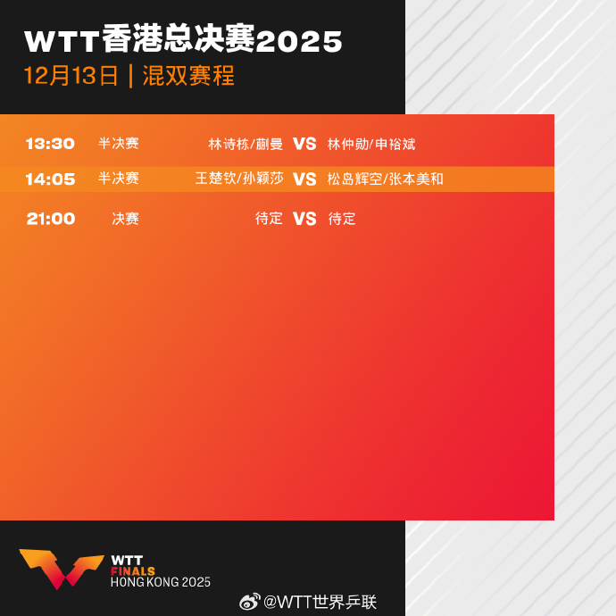 【點新聞報道】WTT香港總決賽2025今日(13日)比賽繼續。混雙冠軍即將誕生,同時男單1/4決賽和女單半決賽密集開打,孫穎莎可能面臨「一日三賽」的高強度挑戰。女單內戰,國乒提前包攬獎牌。具體賽程如下: