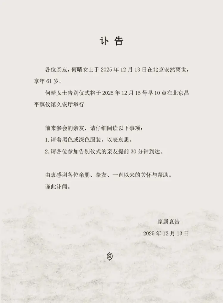 【點新聞報道】一份家屬發布訃告顯示,著名演員何晴12月13日在北京安然離世,享年61歲。告別儀式將於2025年12月15日上午10點在北京昌平殯儀館久安廳舉行。