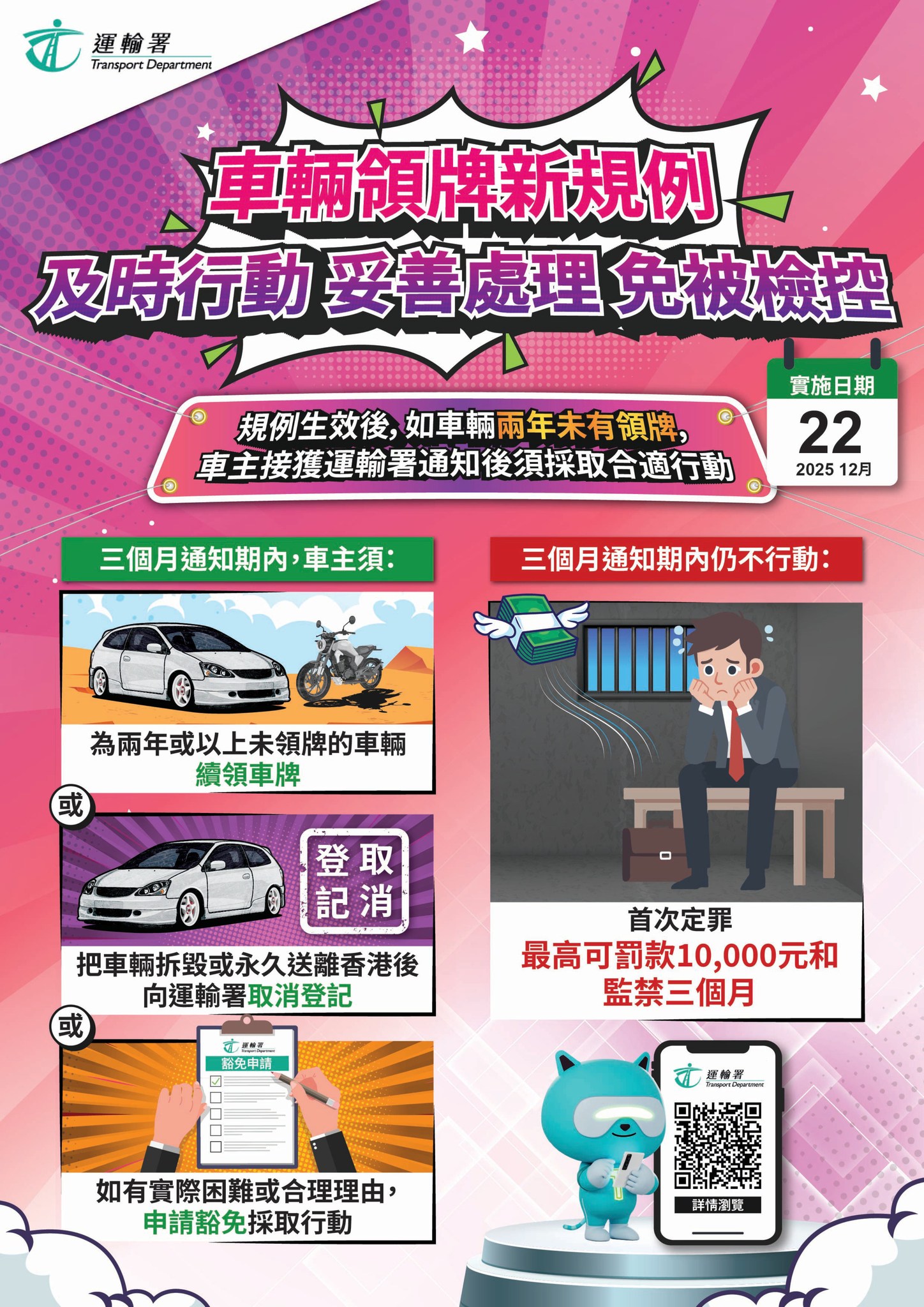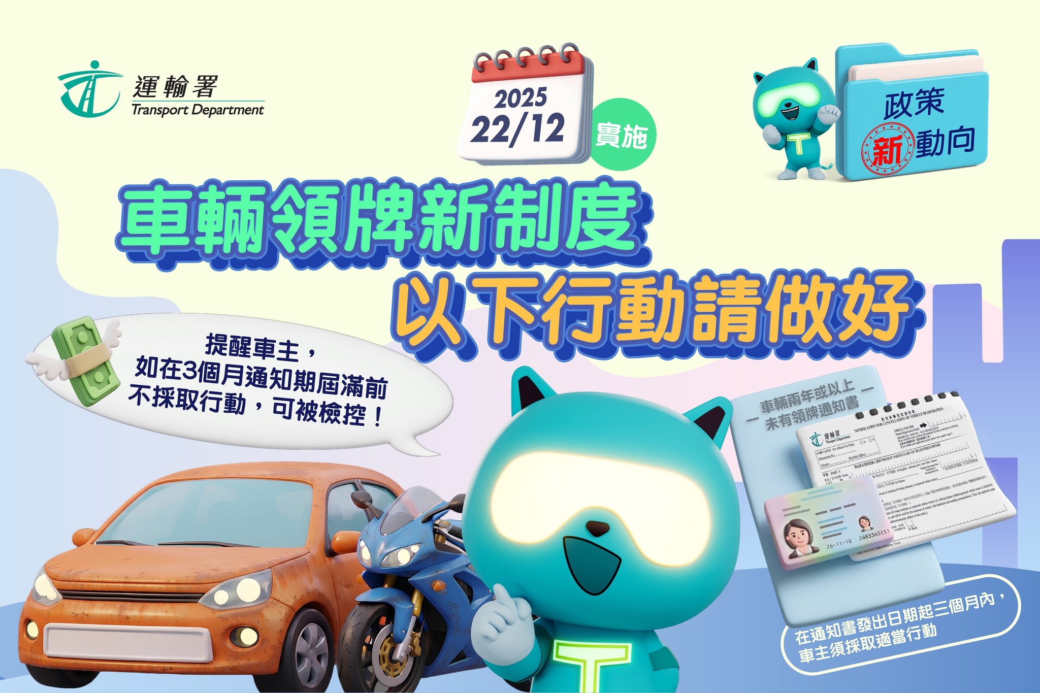 運輸署發言人表示,由12月22日起,署方將向兩年或以上未領牌車輛的登記車主發出通知書,要求車主必須在發出通知書日期的三個月內為車輛領牌,或把車輛拆毀或永久送離香港後,將相關證明文件提交運輸署,並取消登記。運輸署提醒,車主須及時妥善處理車輛,以免觸犯法例。