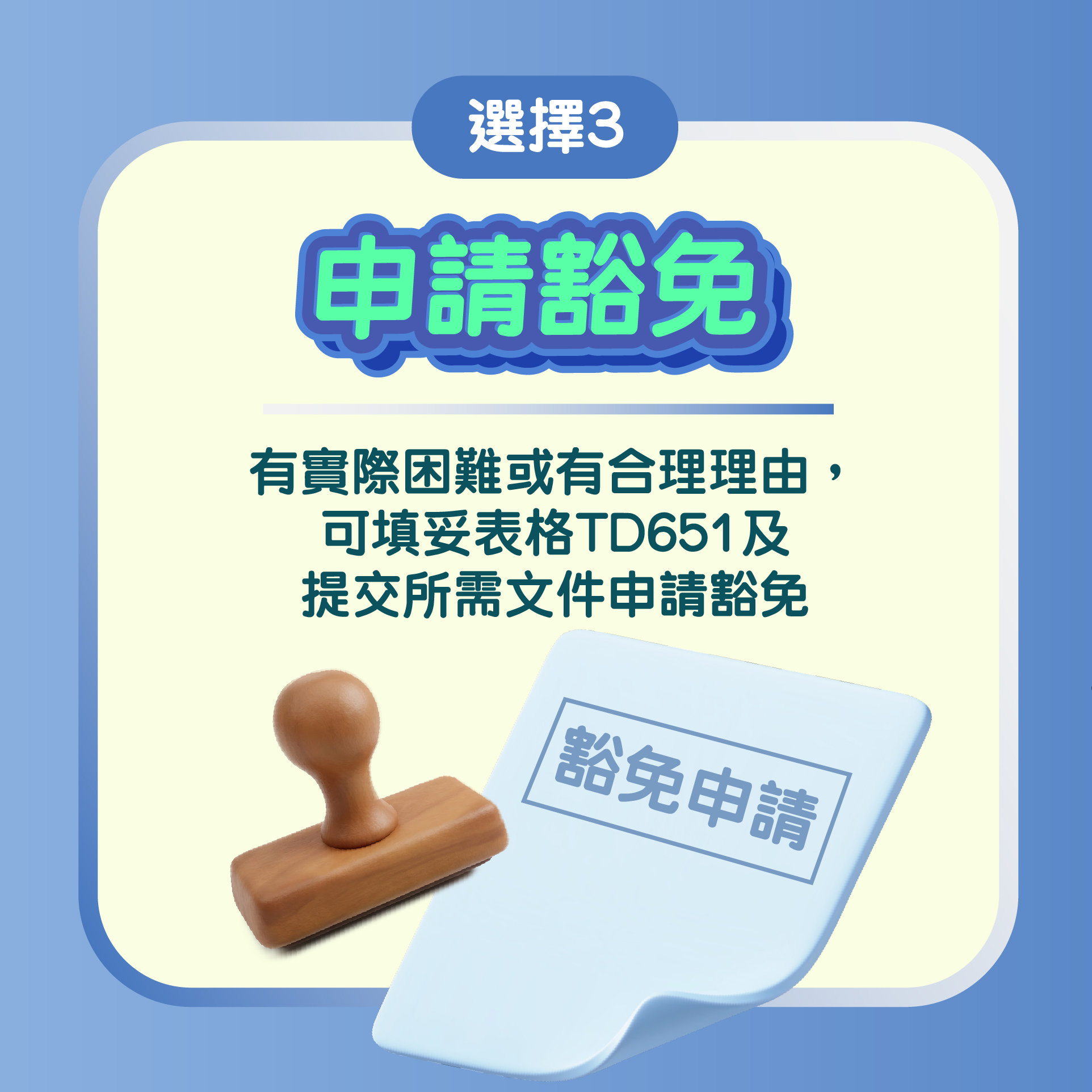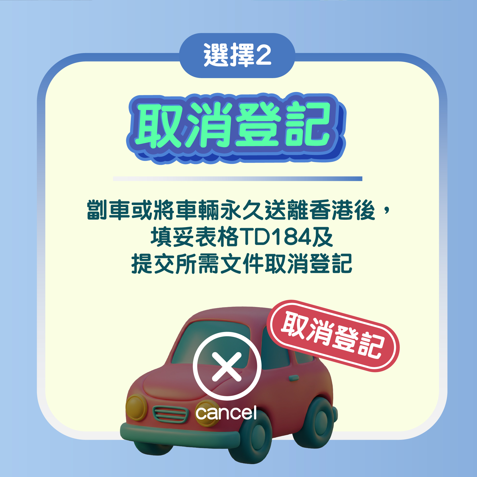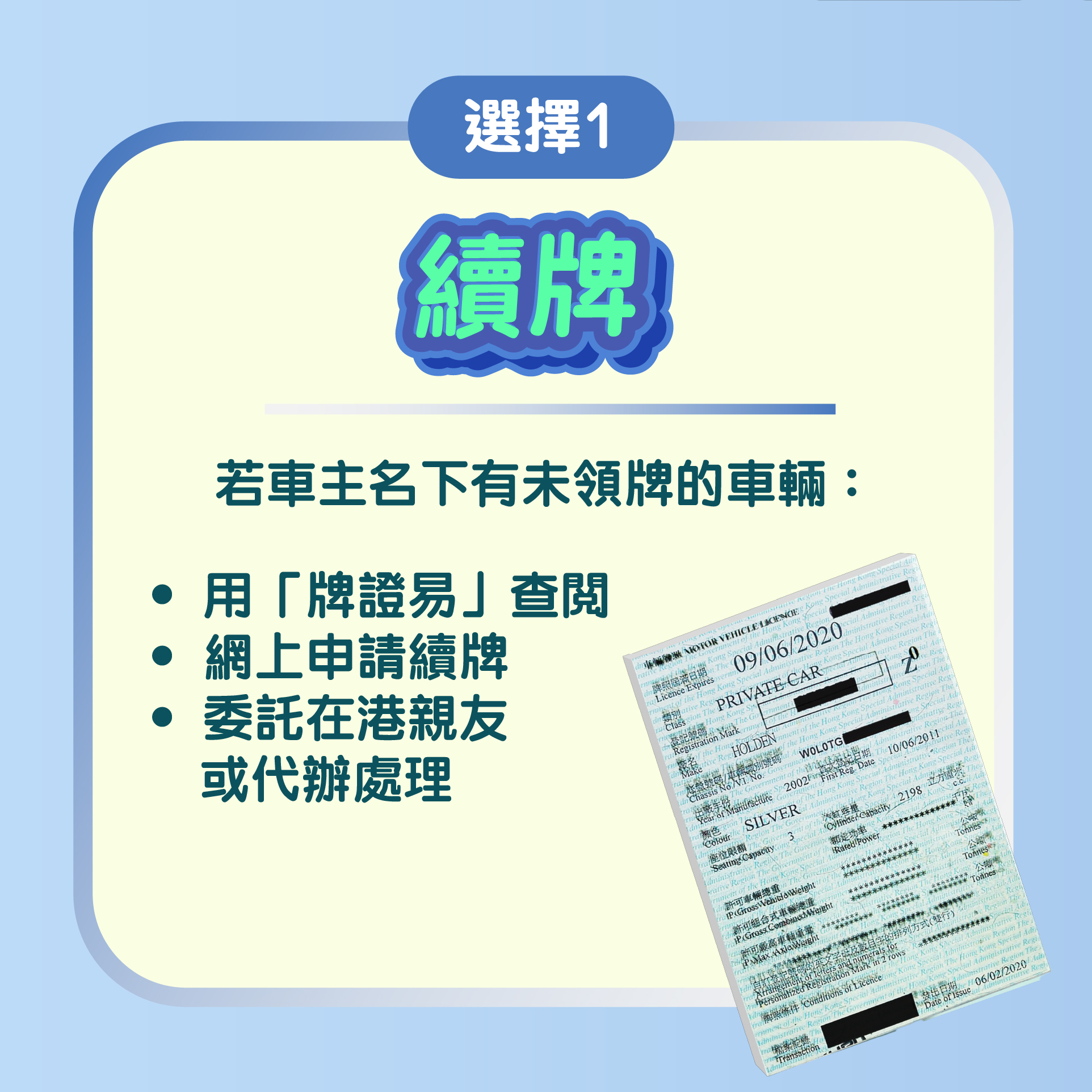 個別車主如有實際困難而未能在三個月通知期屆滿前採取所需行動,或有合理理由不為其車輛領牌,可向運輸署申請豁免,包括等待零件維修送驗後續牌的車輛;車齡30年或以上、正妥善保存作私人收藏而不會在路上使用的車輛;妥善保存於車輛經銷商作寄賣的車輛。運輸署提醒車主,即使未為車輛領牌或成功申請豁免,車輛仍會一直登記在其名下,車主須繼續承擔車輛引起的所有法律責任。
