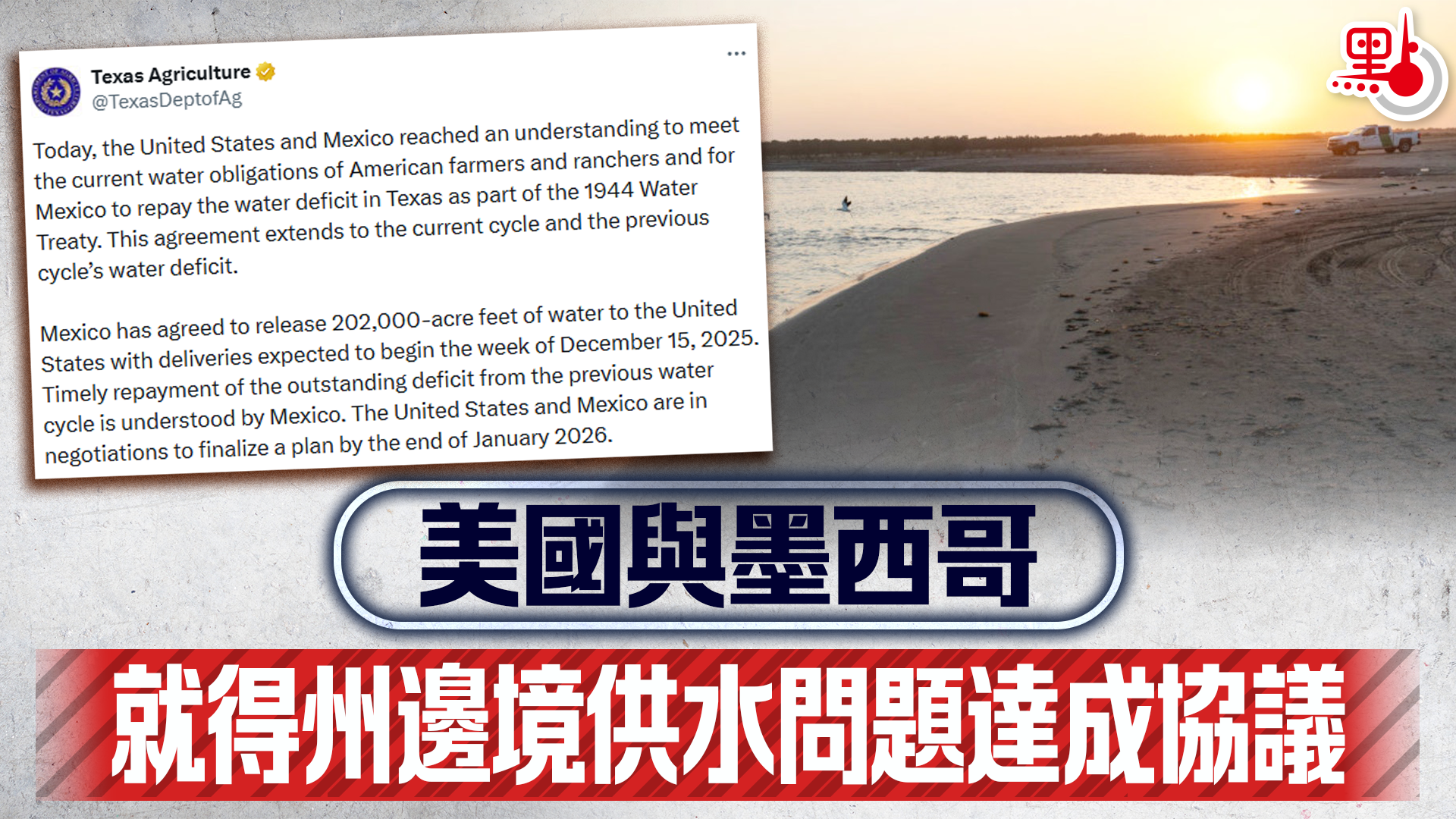 墨西哥外交部則於13日發表聲明指,協議將在兩國《水資源條約》框架下,加強里奧格蘭德河(Rio Grande)的水資源管理。