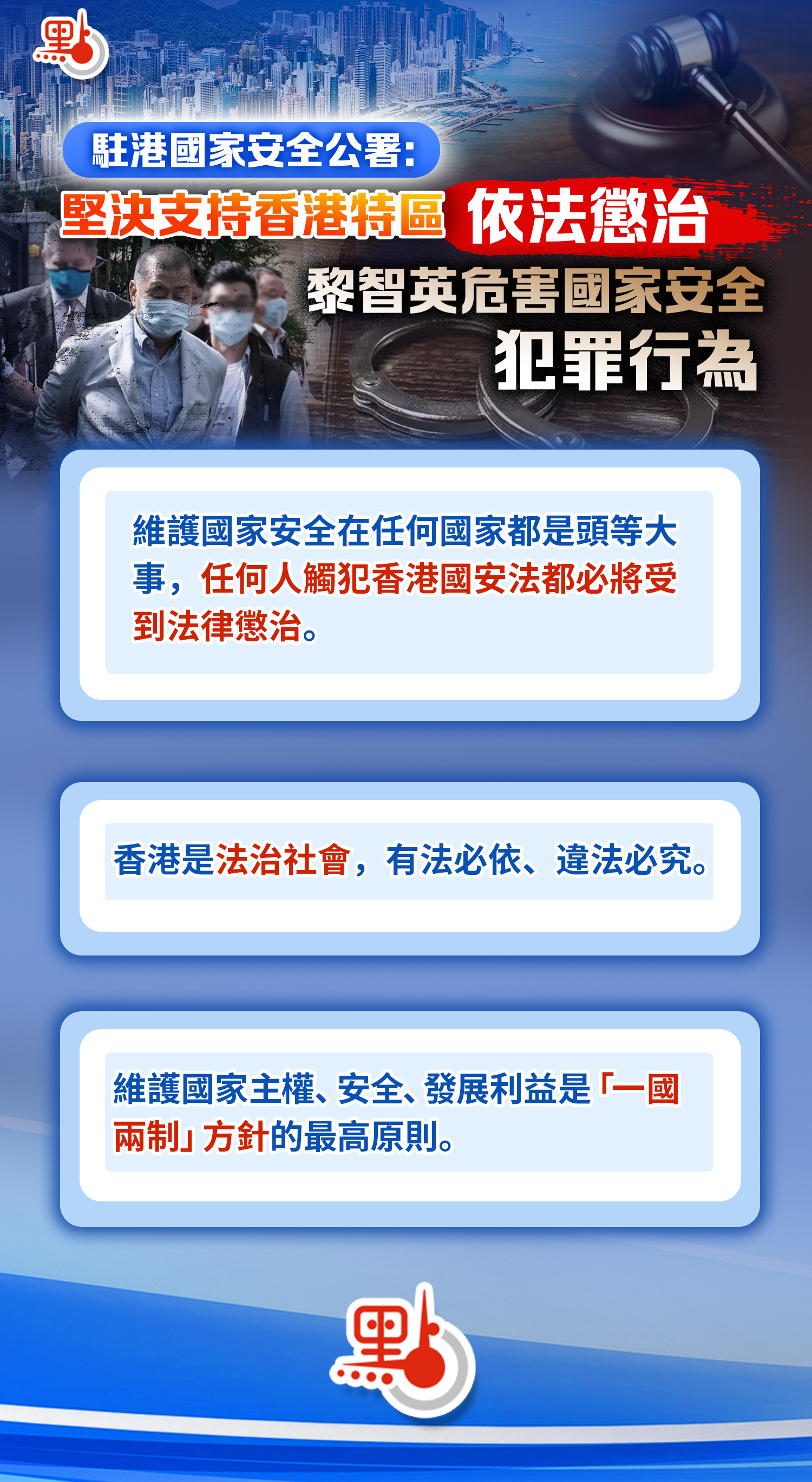 肥黎罪成|國安公署:堅決支持香港特區依法懲治黎智英危害國家安全犯罪行為