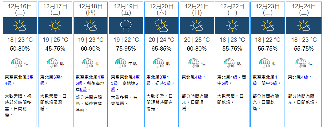 根據天文台最新九天天氣預報,本周四(18日)至周五(19日)或有幾陣雨,到周日(21日)冬至日部分時間有陽光,日間溫暖,氣溫介乎20度至25度。另外,下周三(24日)平安夜部分時間有陽光,日間乾燥,氣溫介乎18度到23度。