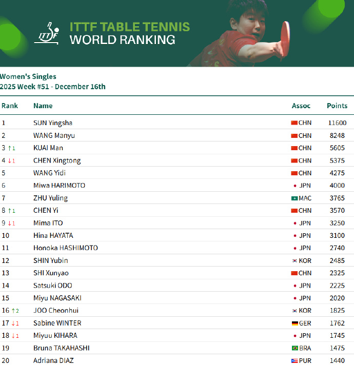 【點新聞報道】北京時間12月16日,國際乒聯公布2025年第51周世界排名,孫穎莎連續179周位居女單第1,王楚欽依然位列男單榜首,蒯曼升至女單世界第3。