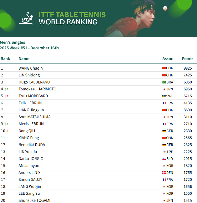 男單方面,王楚欽9925分排名第1,林詩棟排名第2,梁靖崑位列第7,向鵬第11。