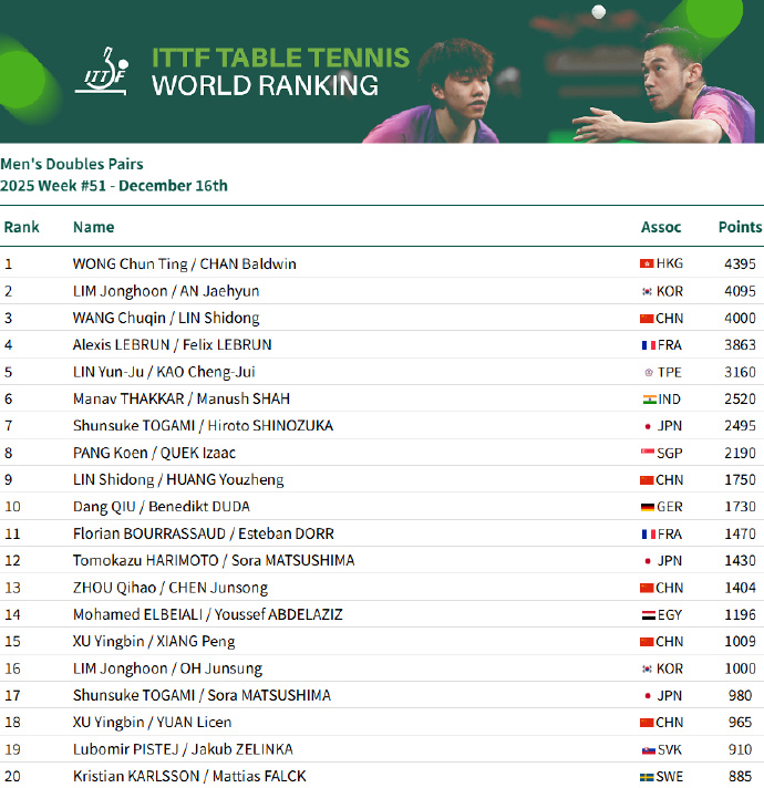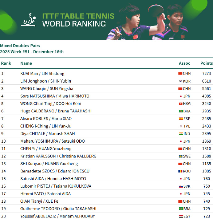 混雙方面,林詩棟/蒯曼位列榜首,王楚欽/孫穎莎第3,黃友政/陳熠第11。