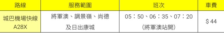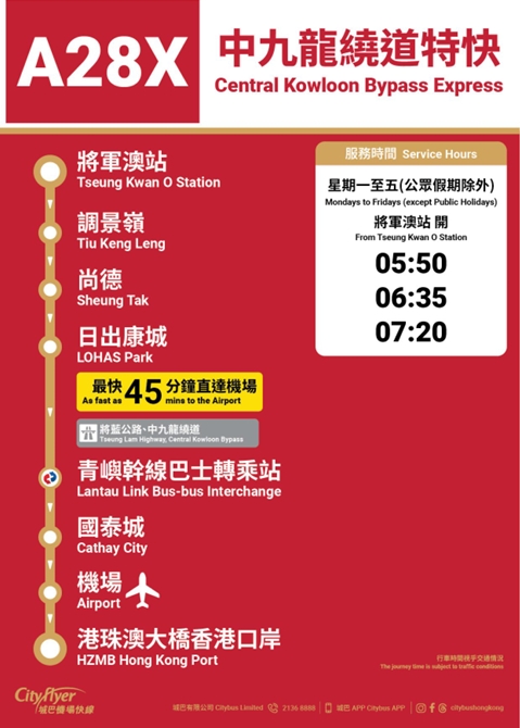 除原有城巴機場快線A28(日出康城往返機場),城巴12月22日起開辦全新城巴機場快線A28X,提供更頻密的清晨班次,進一步惠及將軍澳、調景嶺、尚德及日出康城乘客出行。新路線將於每個工作日(星期一至五)提供服務,發揮近年兩大焦點基建項目將藍公路及中九龍繞道的優勢,由日出康城上車最快45分鐘便可直達機場,較其他路線快一倍時間、較鐵路轉乘多次更快、更舒適、更實惠。