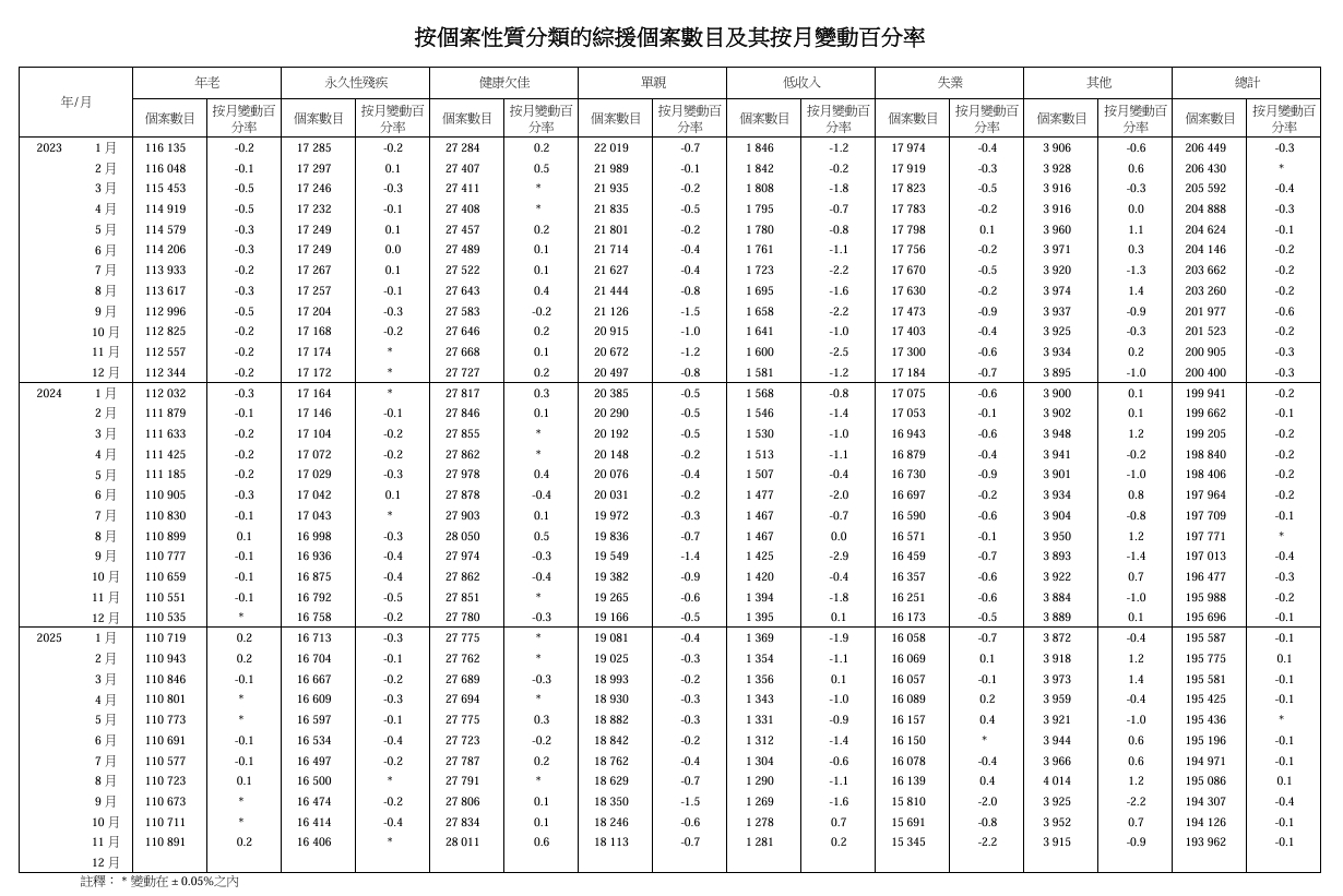 11月底領取綜援的個案總數為193,962宗,受助總人數為256,425。就個案類別分析,失業類別個案的按月跌幅為2.2%,有15,345宗。單親類別個案下跌0.7%,有18,113宗。健康欠佳類別個案則上升0.6%,有28,011宗。年老類別個案及低收入類別個案均上升0.2%,分別有110,891宗及1281宗。永久性殘疾類別個案保持平穩,有16,406宗。