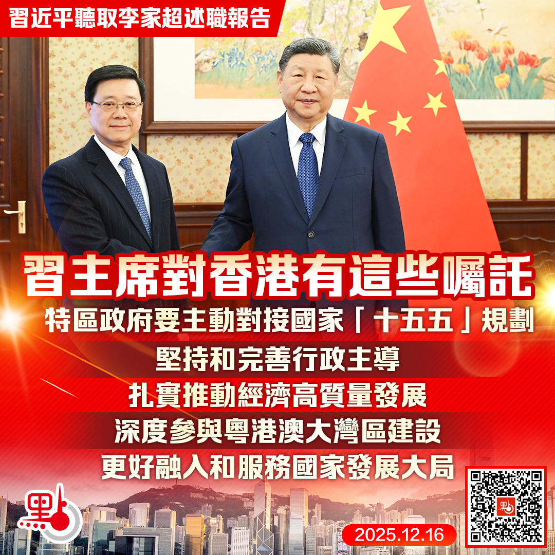 習近平指出,中國共產黨二十屆四中全會對「十五五」時期國家經濟社會發展作出戰略擘畫,強調要堅定不移貫徹「一國兩制」、「港人治港」、高度自治方針,促進香港長期繁榮穩定。特別行政區政府要主動對接國家「十五五」規劃,堅持和完善行政主導,扎實推動經濟高質量發展,深度參與粵港澳大灣區建設,更好融入和服務國家發展大局。