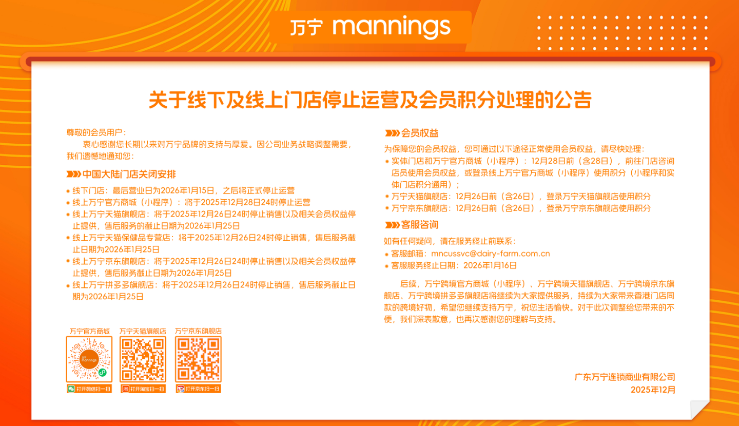 公告指,因公司「業務戰略調整需要」,關閉中國內地門店。其內地線下門店最後營業日為2026年1月15日,之後將正式停止運營;其線上萬寧官方商城(小程序)將於2025年12月28日24時停止運營,而天貓旗艦店、京東旗艦店、天貓保健品專營店則將在2025年12月26日停運。