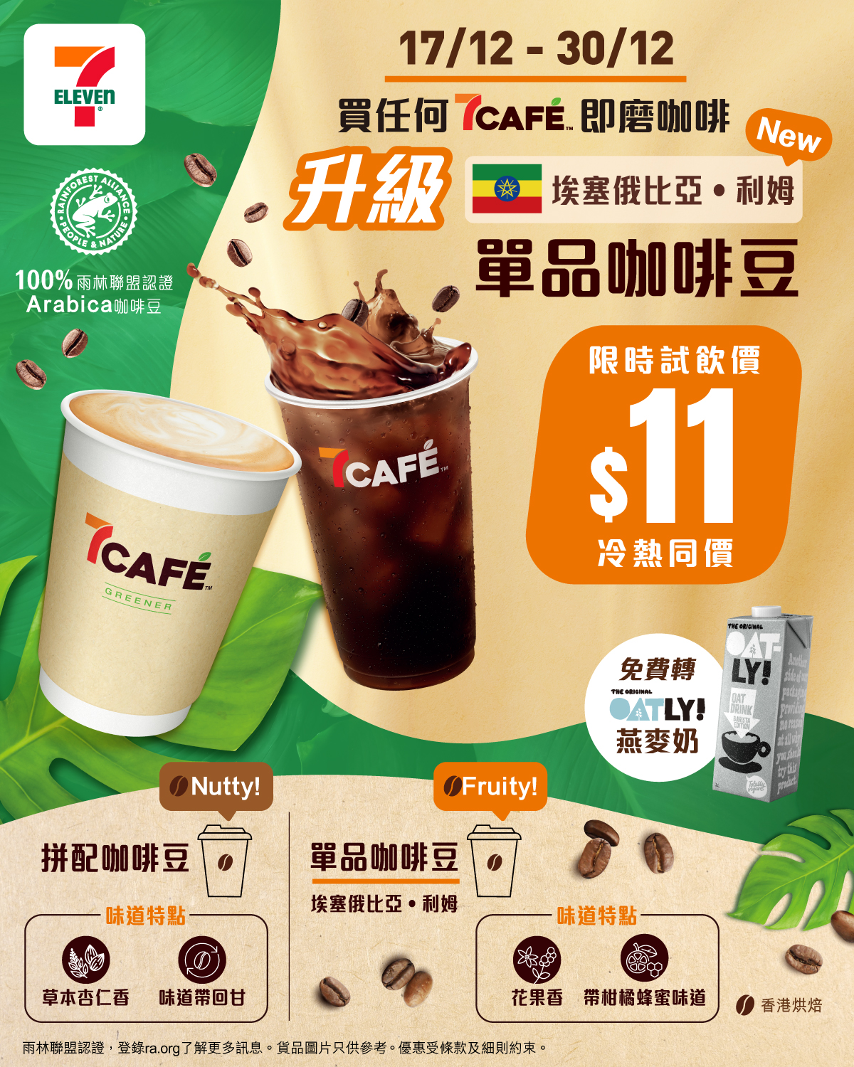 【點新聞報道】7CAFÉ推出全新單品咖啡豆!由即日(17日)起至12月30日,買任何7CAFÉ即磨咖啡升級至單品咖啡豆,可享$11限時試飲優惠,凍熱同價。