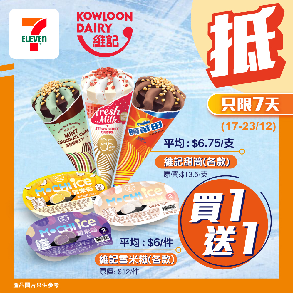 凍冰冰就特別想食雪糕。由即日起至12月23日,來7仔買維記甜筒或維記雪米糍,即享買一送一震撼優惠。維記甜筒(各款)買一送一平均每支$6.75;維記雪米糍(各款)買一送一平均每件$6。優惠有效期由2025年12月17日早上7時至12月23日。