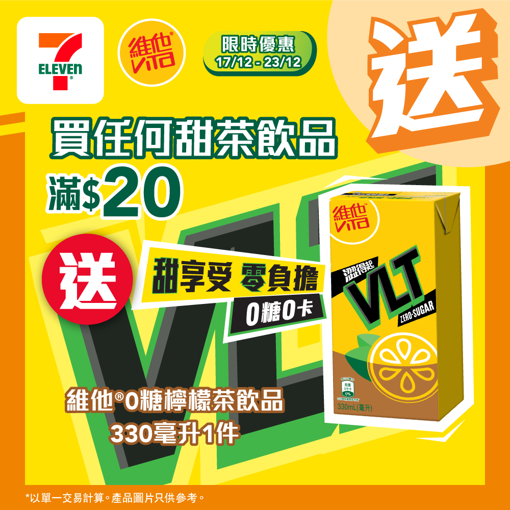 由即日起至12月23日,來7仔買任何甜茶飲品滿$20,即送維他0糖檸檬茶飲品330毫升1件,零負擔享受甜茶味道。優惠有效期由2025年12月17日早上7時至12月23日。