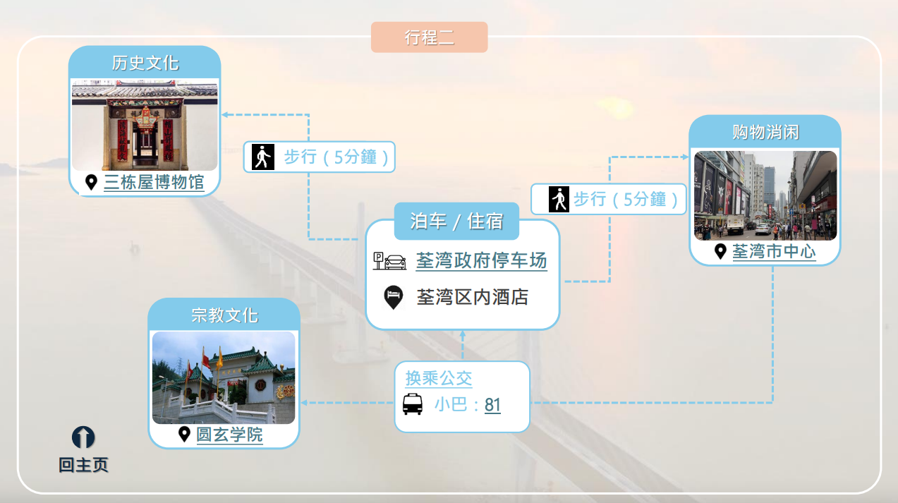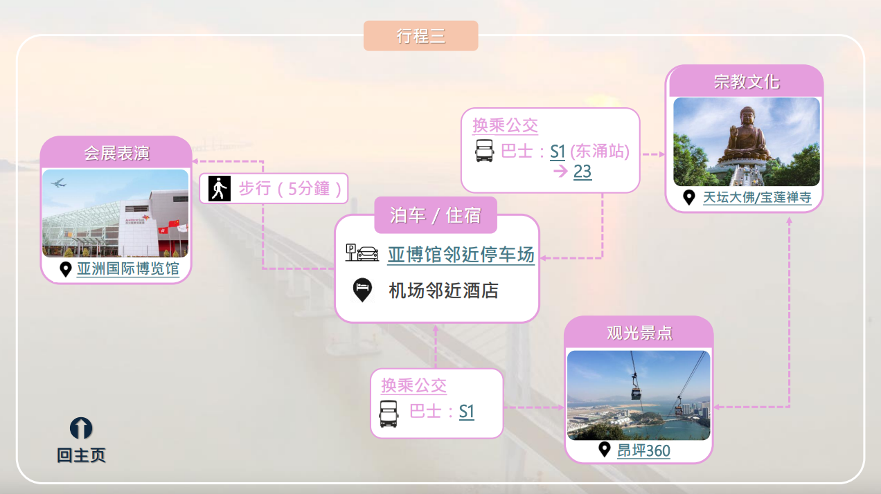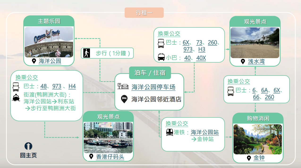 可參考下列「旅遊泊車指南」,配搭自駕與公交,按各自喜好選擇有關文化、體育、展覽、購物及主題樂園行程路線。