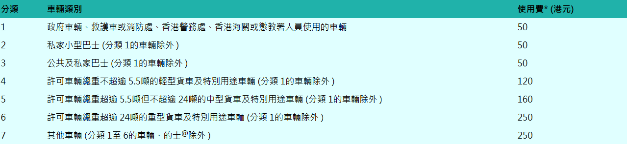 香港仔隧道、城門隧道、獅子山隧道、沙田嶺隧道、尖山隧道及大圍隧道收費為8港元。