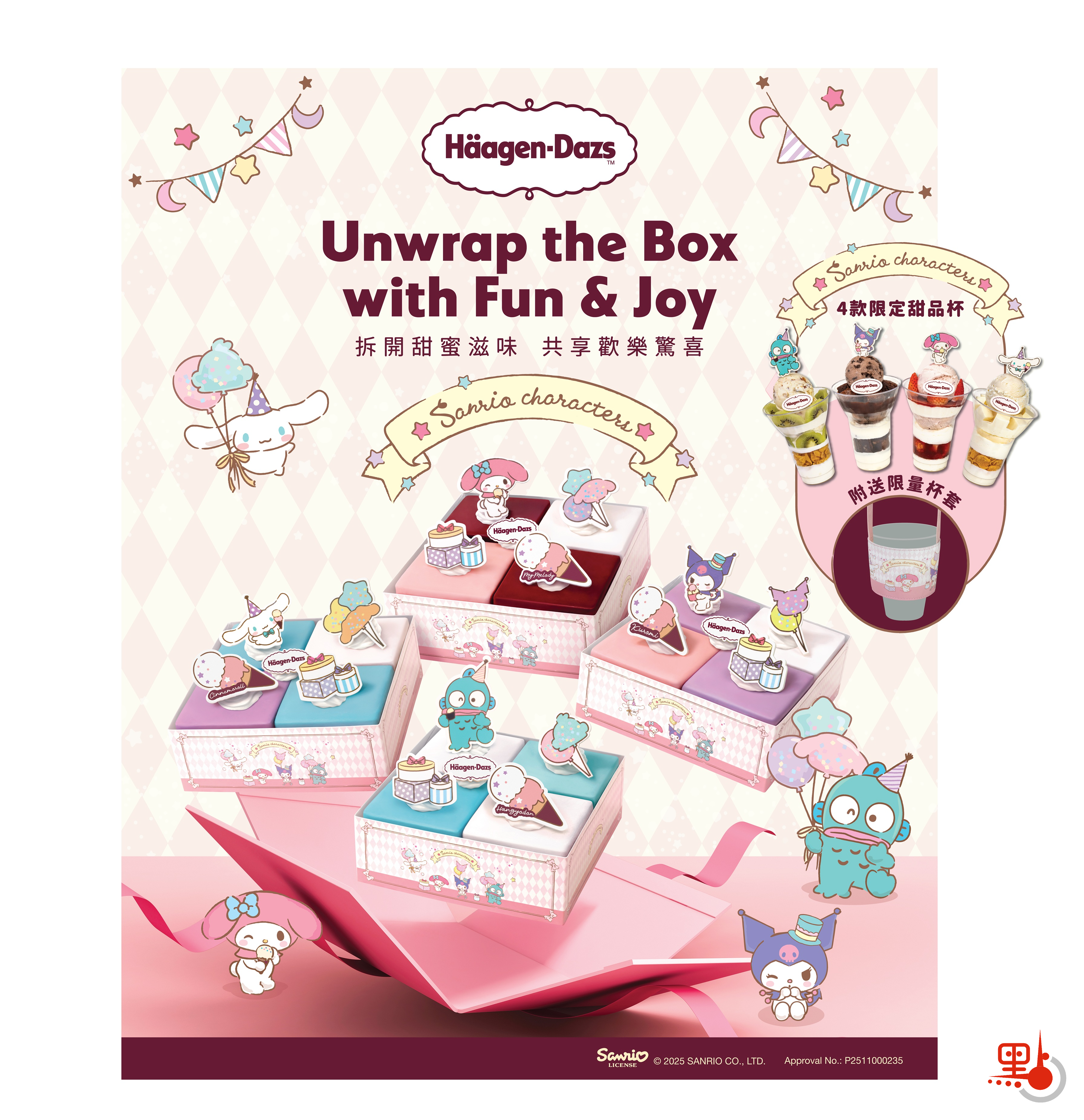 Sanrio characters限定甜品杯以Häagen-Dazs™ 絲滑雪糕,搭配香甜果粒、可口餅乾、奶凍與脆片,打造出四款層次豐富、口感多變的甜品組合,兼具視覺享受,五感一次過滿足!凡購買甜品杯即附可重用的限量杯套,萌度爆表的角色設計,瞬間融化你的心!