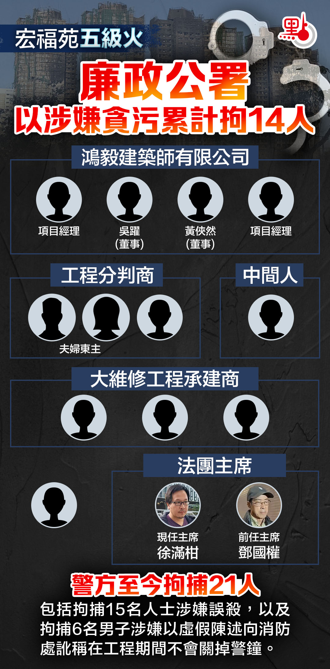 宏福苑五級火·一圖|廉署累計拘14人 包括新舊法團主席