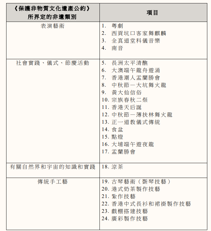 非遺代表作名錄現共有24個項目,傳承人的責任為開展相關項目的傳承活動、培養後繼人才、妥善保存相關實物/資料、進行研究、參與宣傳或教育推廣等。申請者須為香港永久性居民,申請條件和評審準則如下: