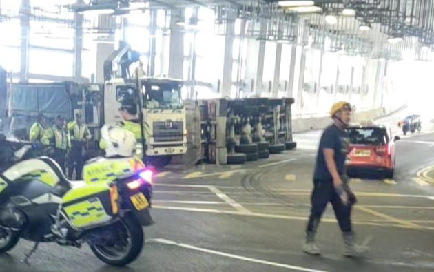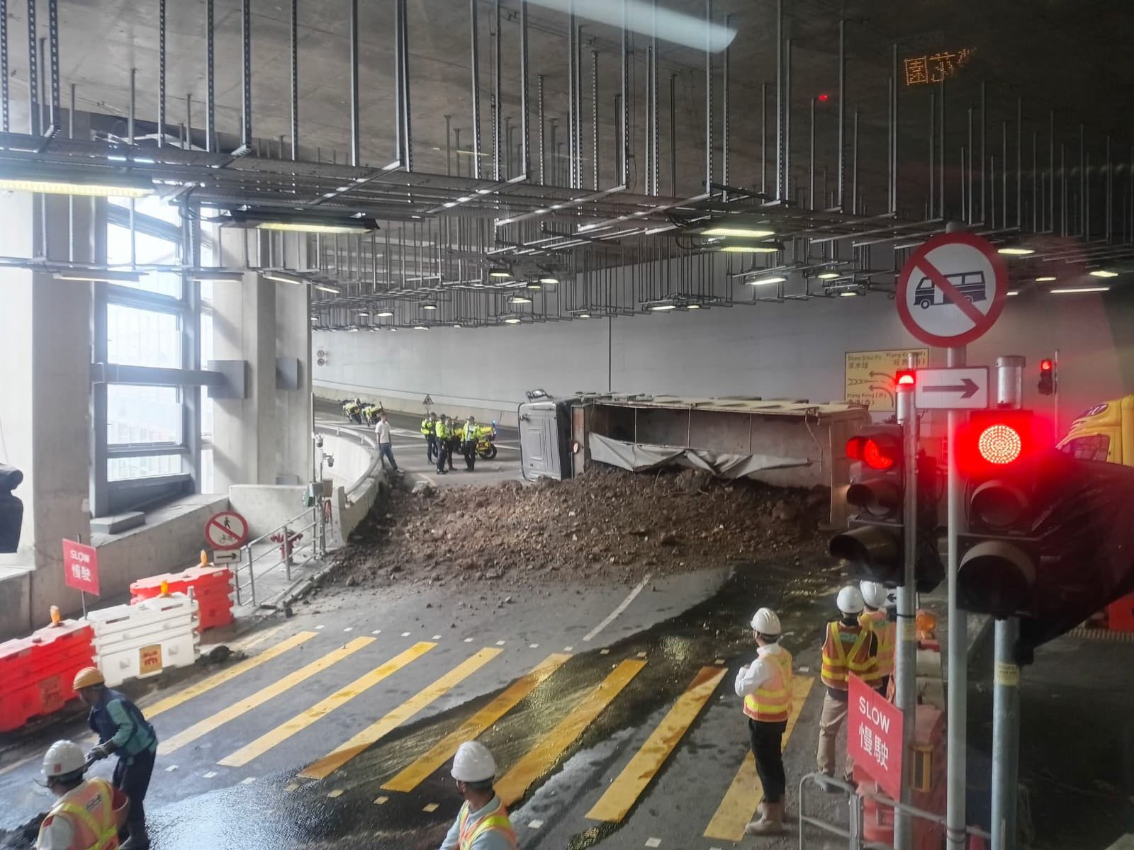 大角咀海泓道泥頭車翻側 泥石散落淹沒行車線