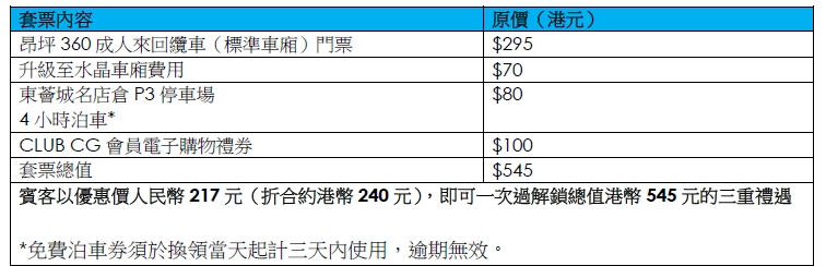 由即日起,持有效「香港運輸署粵車南下(入境市區部分)車輛預約確認憑證」的賓客,透過攜程App購買此套票即可享有多重專屬禮遇,包括昂坪360來回纜車標準車廂免費升級至水晶車廂、東薈城名店倉4小時免費泊車以及成為CLUB CG會員即獲100港元電子購物禮券。