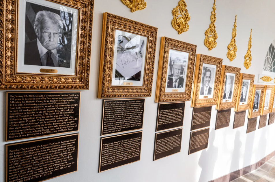 【點新聞報道】據美國廣播公司18日報道,美國總統特朗普在此前打造的白宮西翼柱廊的歷任總統像下又新安裝了銘牌,上面的文字是對相應總統的介紹。白宮新聞秘書卡羅琳·萊維特在一份聲明中說,許多銘牌都是由「總統親自撰寫的」。