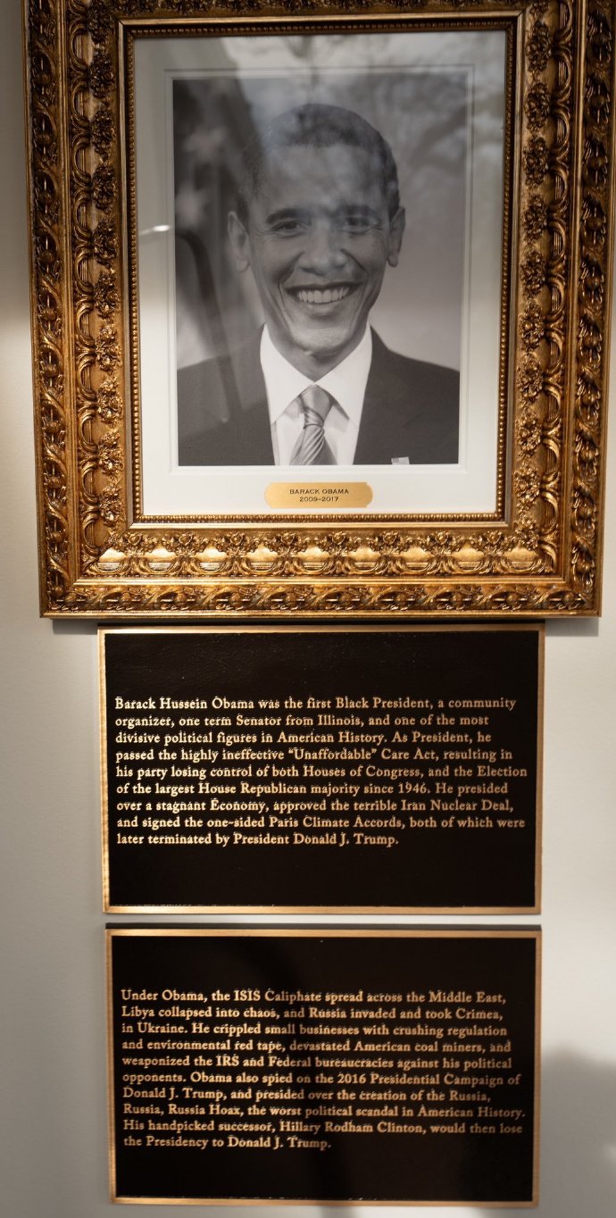 例如,拜登對應的畫像是一隻自動簽字筆,下方的銘牌寫道,「瞌睡喬是歷史上最糟糕的總統」,並補充說「他在美國歷史上最腐敗的選舉中上任」;介紹奧巴馬的文字形容其是「美國歷史上最具爭議的政治人物之一」,稱他「監視了唐納德·特朗普2016年的總統競選,並主導製造了『通俄門』騙局」;在前總統克林頓的像下則寫着「克林頓總統的妻子希拉里輸給了唐納德·特朗普總統失去了總統寶座」……