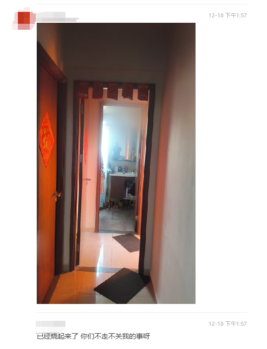 【點新聞報道】12月18日,網傳廣東珠海一小區有人縱火。據網傳綠景璽悅灣(南區)業主群聊天紀錄,一名業主疑酒後突然在業主群發言,要點火燒房子,請一單元的業主全部離開,之後還發圖稱已經燒起來了。另有網傳視頻顯示,樓棟一房間內冒出黑煙,火光熊熊。