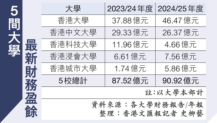 【點新聞報道】香港多所大學近日相繼發表2024/2025年度財務資料,在特區政府財赤的情況下,各所資助大學年內需要退還共40億元教資會撥款儲備,惟各大學整體財政仍非常穩健。綜合香港大學、香港中文大學、香港科技大學、香港浸會大學及香港城市大學已發布最新財務報告/財務摘要的數字,其中三所年度盈餘有增加,兩所則略減。五校總計盈餘超過90億元,較之前不用「回水」的2023/2024年還多出3.4億元。