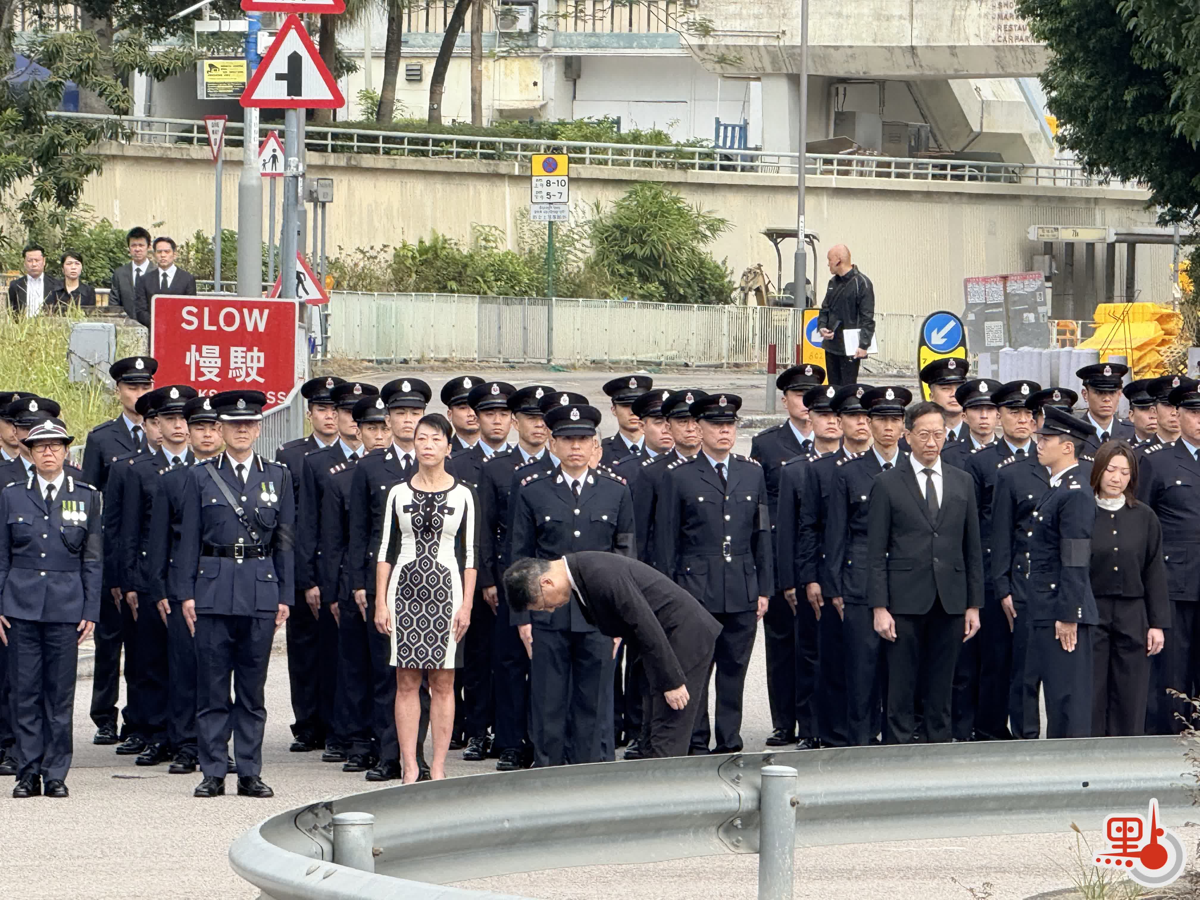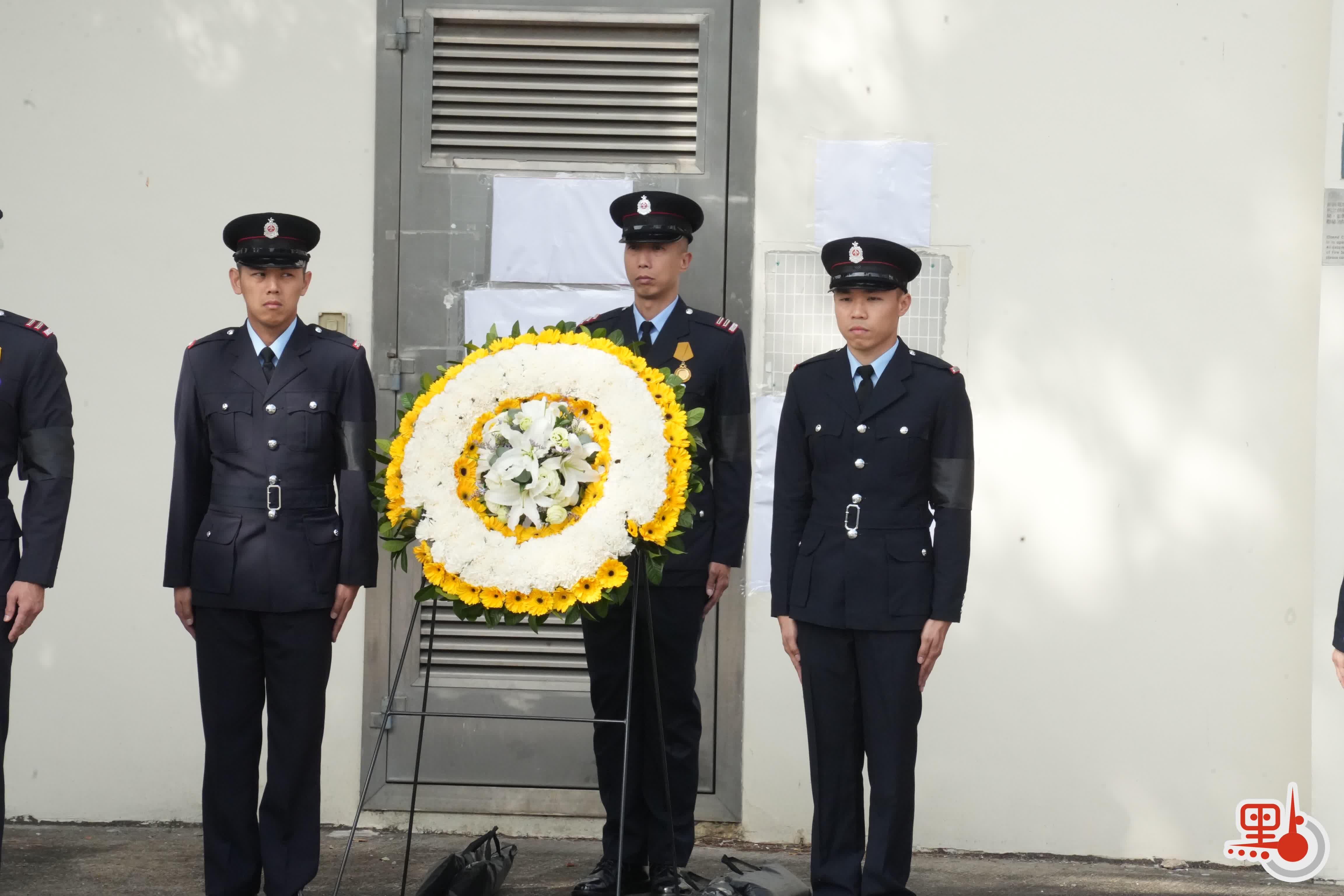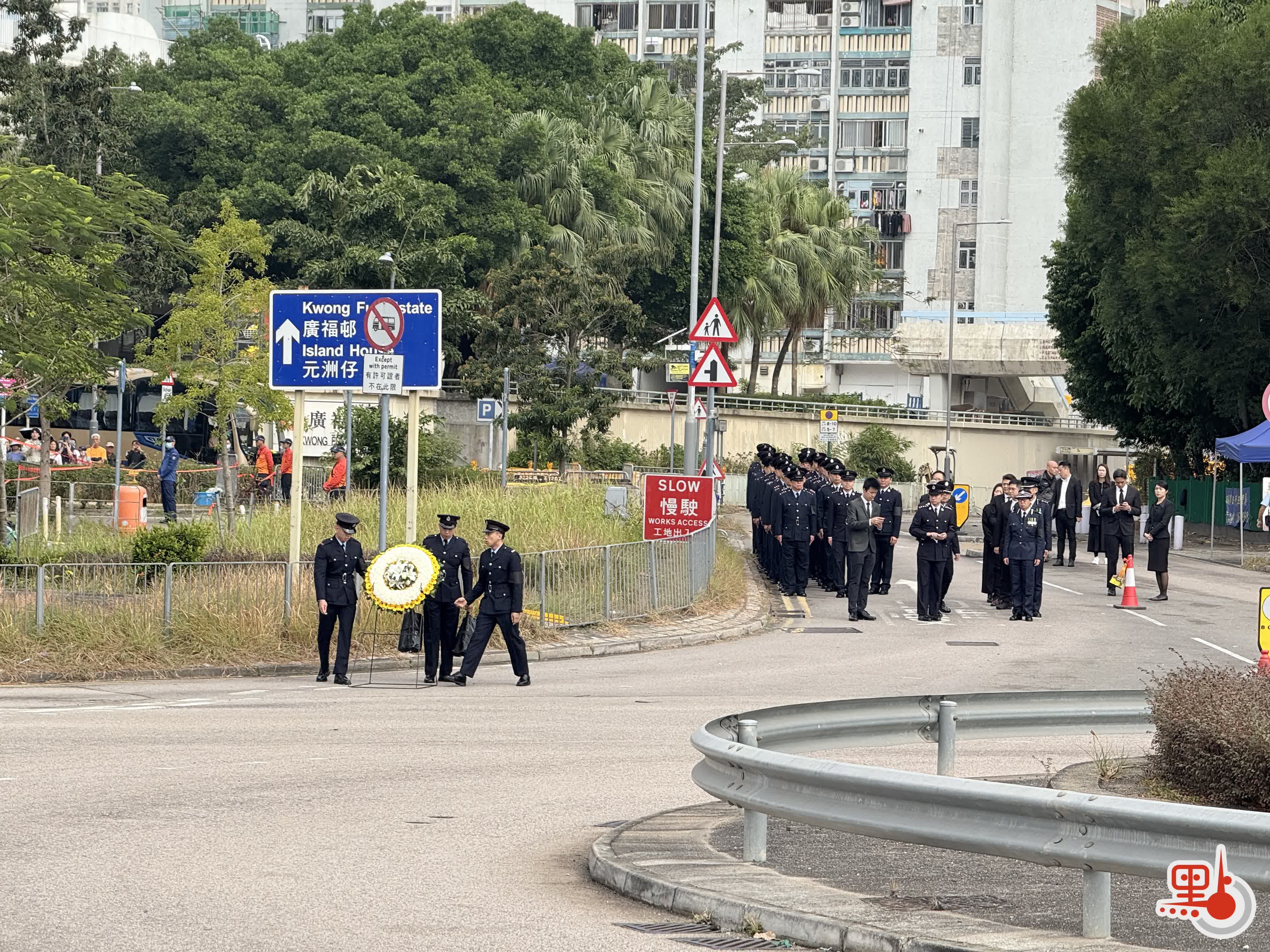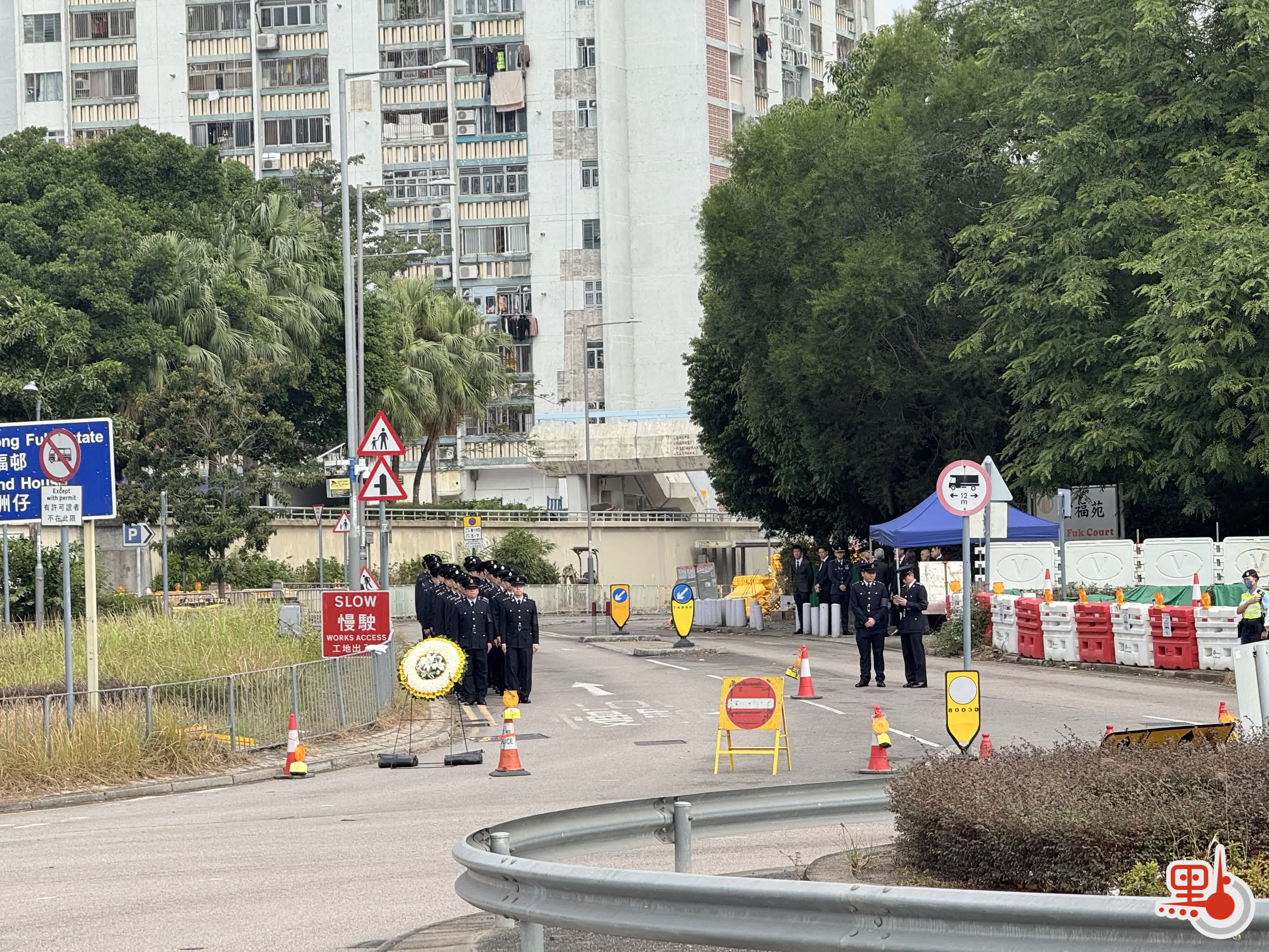 靈車11時10分左右到場,面向宏福苑方向停泊。消防人員向靈車方向獻花圈,其後警務處新界北總區指揮官林敏嫻等警務人員依次向靈車鞠躬,向何偉豪致意。