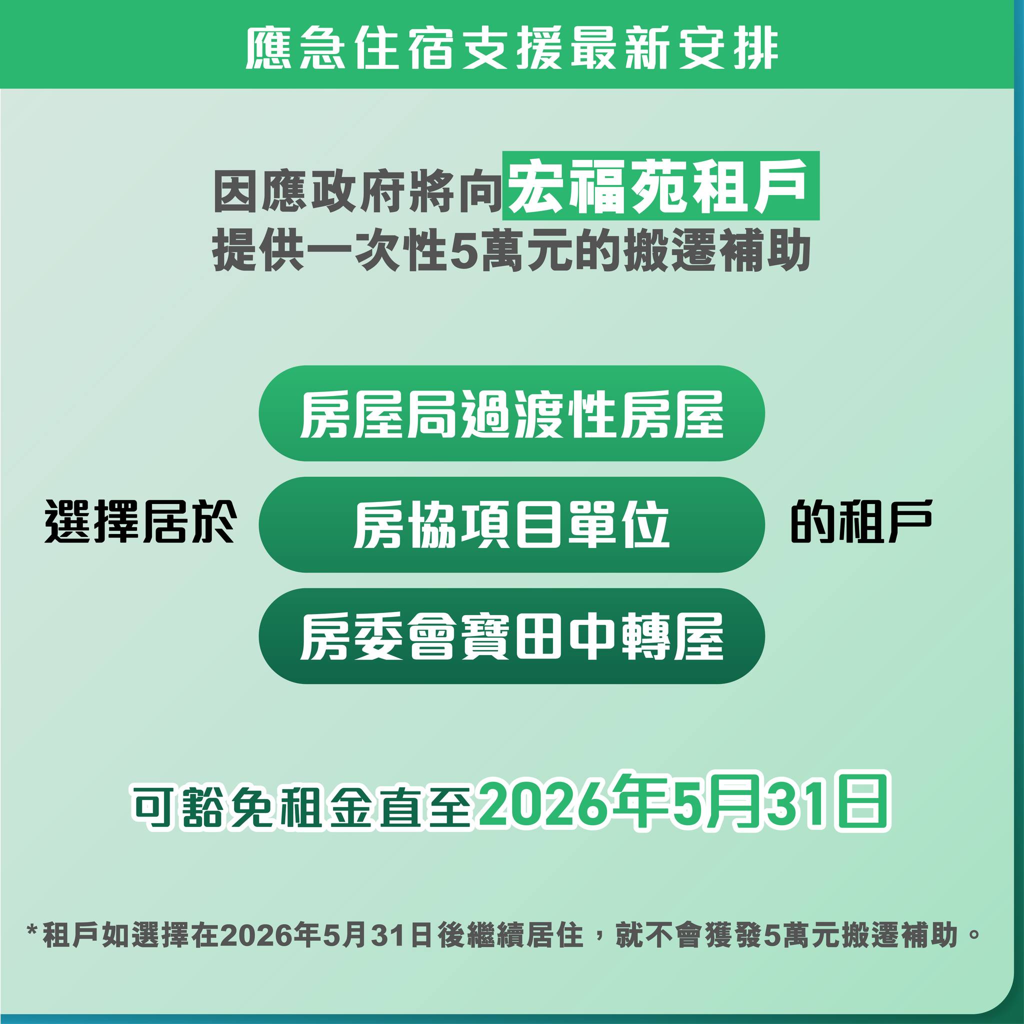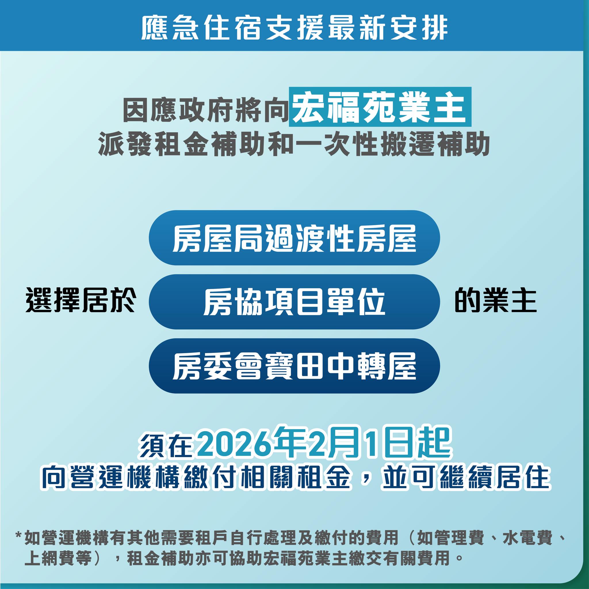 點新聞早前向房屋局查詢,受影響的宏福苑業主是否同租戶享有同樣的免租金待遇至2026年5月31日。當時房屋局回覆指,宏福苑業主收取租金津貼後,他們可以自行決定居住安排。他們可以居住於過渡性房屋、房協項目單位或寶田的中轉屋,亦可以到私人市場自行租屋。房屋局亦透露,考慮要求宏福苑業主於2026年2月開始向營運機構繳付相關租金。