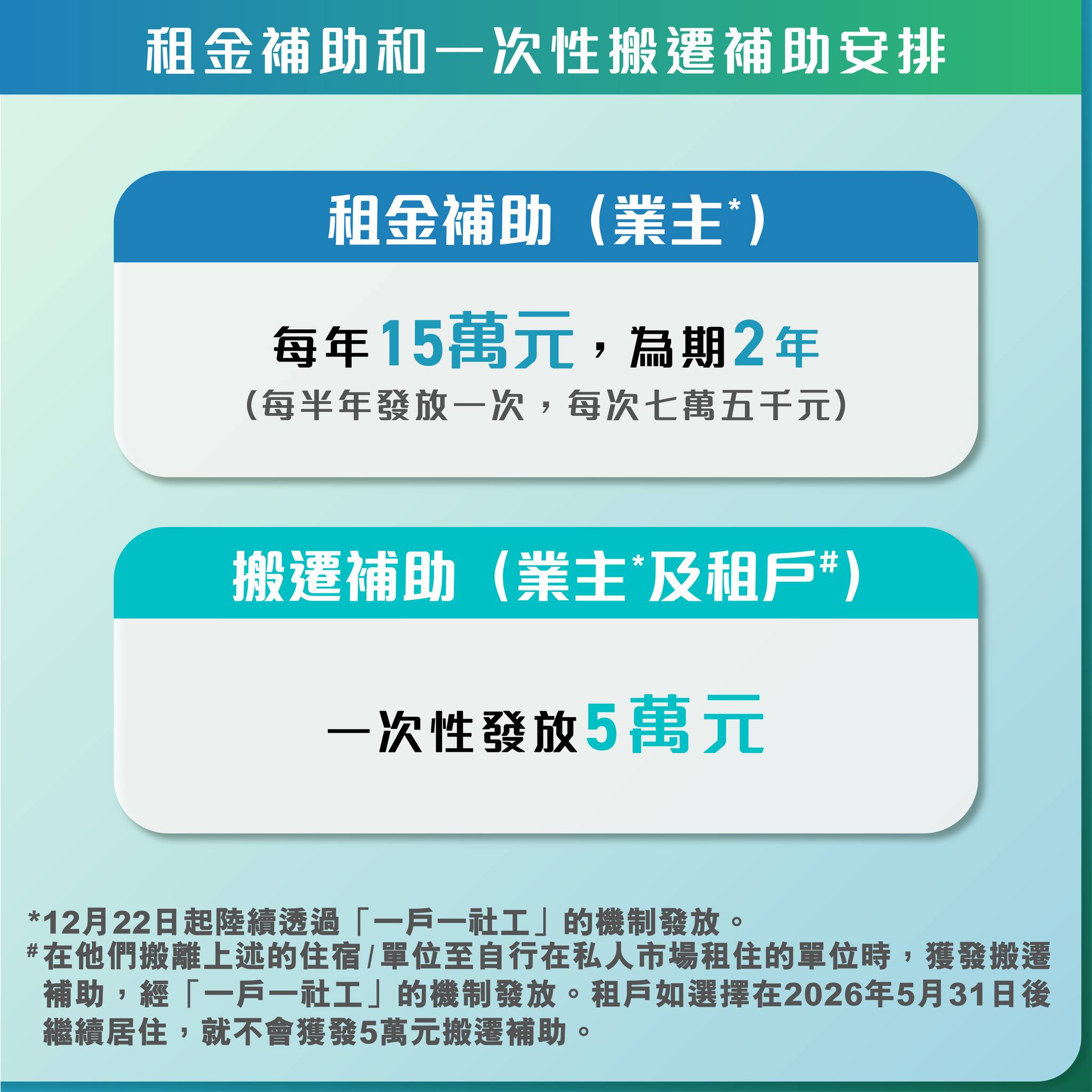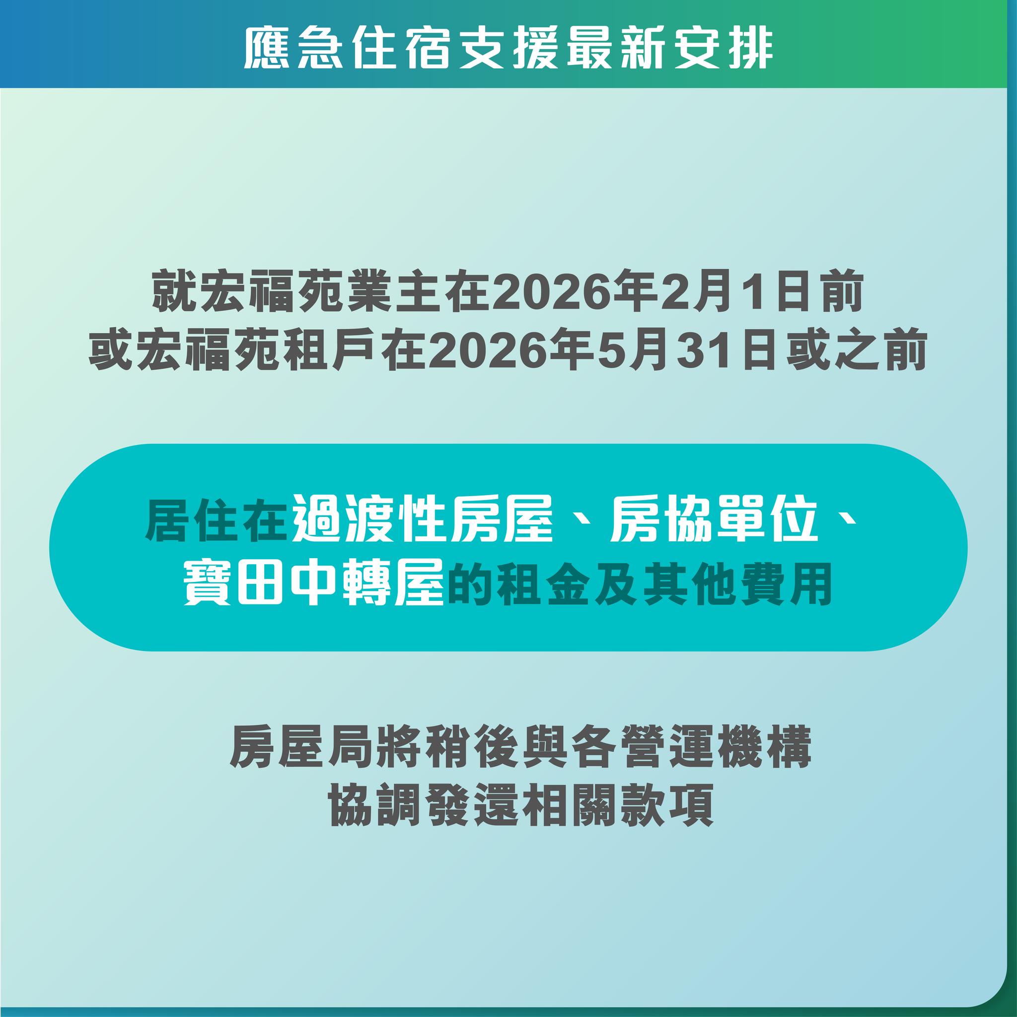 何永賢今日在社交平台發文「官宣」,若選擇住在過渡性房屋、房協單位及寶田中轉屋的宏福苑業主,須在2026年2月1日起向營運機構繳付相關租金,便可繼續居住;宏福苑租戶則可豁免租金直至2026年5月31日。至於宏福苑業主在2026年2月1日前,或宏福苑租戶在2026年5月31日或之前居住在過渡性房屋、房協單位、寶田中轉屋的租金及其他費用,房屋局將稍後與各營運機構協調發還相關款項。