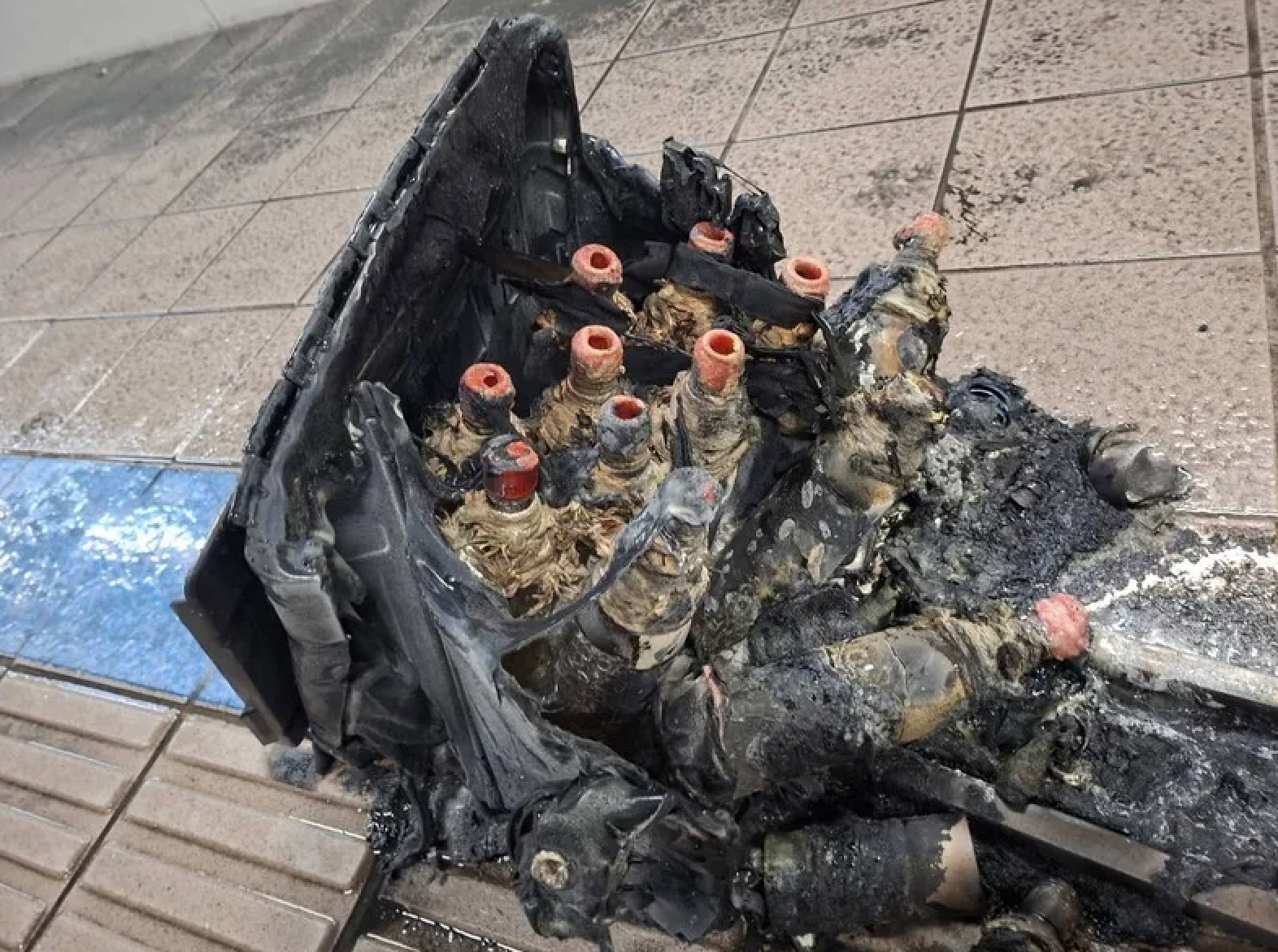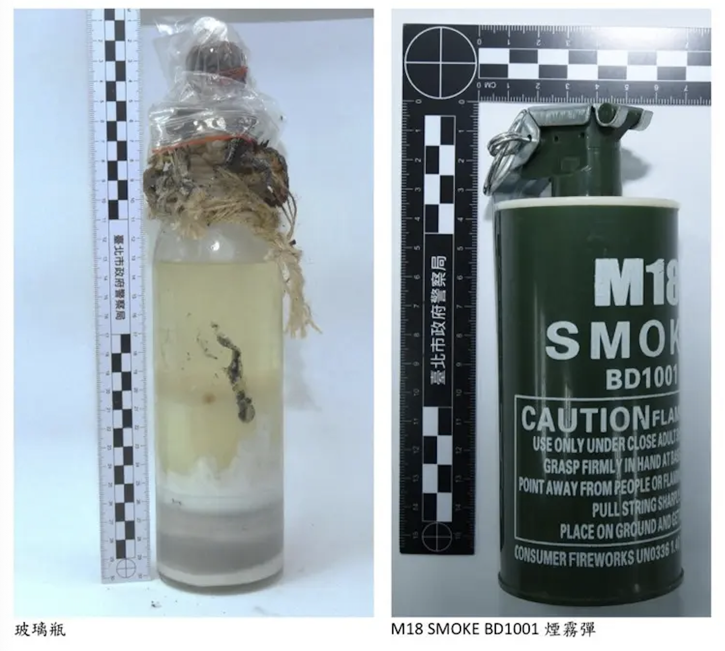 警方指,該箱煙霧彈,17顆使用在北捷連通道、4顆在北捷連通道燒毀的手推行李箱內,另外2顆丟擲在誠品南西店門前馬路上,還有進入誠品南西門口時的1顆未爆彈。