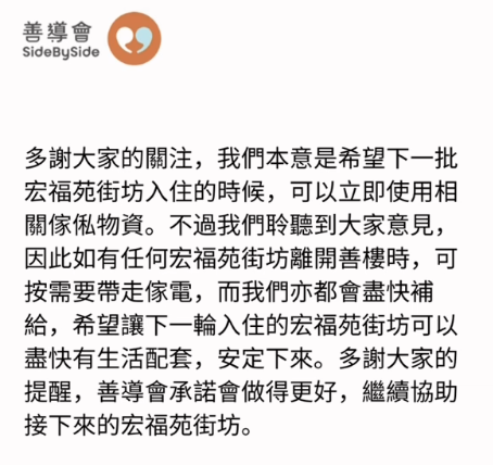 善導會傍晚在社交網站發文,指本意是希望下一批宏福苑居民入住的時候,可以立即使用相關傢俬物資,但聆聽到有關意見,因此如有任何宏福苑居民離開善樓時,可按需要帶走傢具電器,善導會亦會盡快補給,讓下一輪入住的居民可以盡快有生活配套,安定下來。