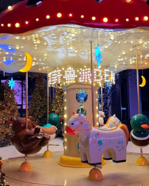 1.平安果造型的旋轉木馬:動物與小木馬組成的夢幻座椅,夜晚亮燈後如閃耀的水晶球。