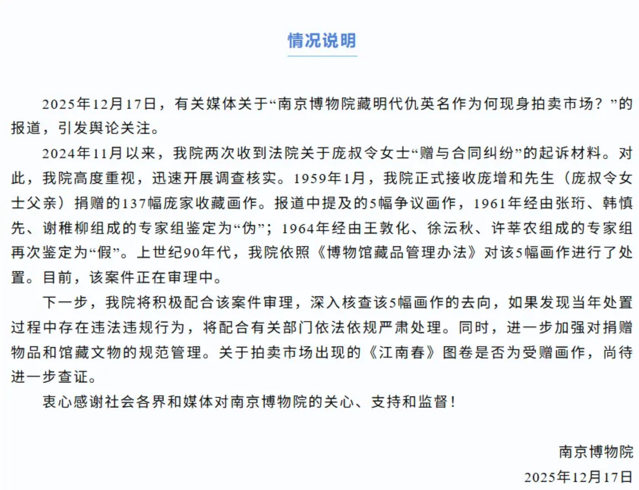 12月17日南京博物院曾發布情況說明:有關媒體關於「南京博物院藏明代仇英名作為何現身拍賣市場?」的報道,引發輿論關注。2024年11月以來,該院兩次收到法院關於龐叔令女士「贈與合同糾紛」的起訴材料。對此,該院高度重視,迅速開展調查核實。1959年1月,該院正式接收龐增和先生(龐叔令女士父親)捐贈的137幅龐家收藏畫作。報道中提及的5幅爭議畫作,1961年經由張珩、韓慎先、謝稚柳組成的專家組鑒定為「偽」;1964年經由王敦化、徐沄秋、許莘農組成的專家組再次鑒定為「假」。上世紀90年代,該院依照《博物館藏品管理辦法》對該5幅畫作進行了處置。目前,該案件正在審理中。