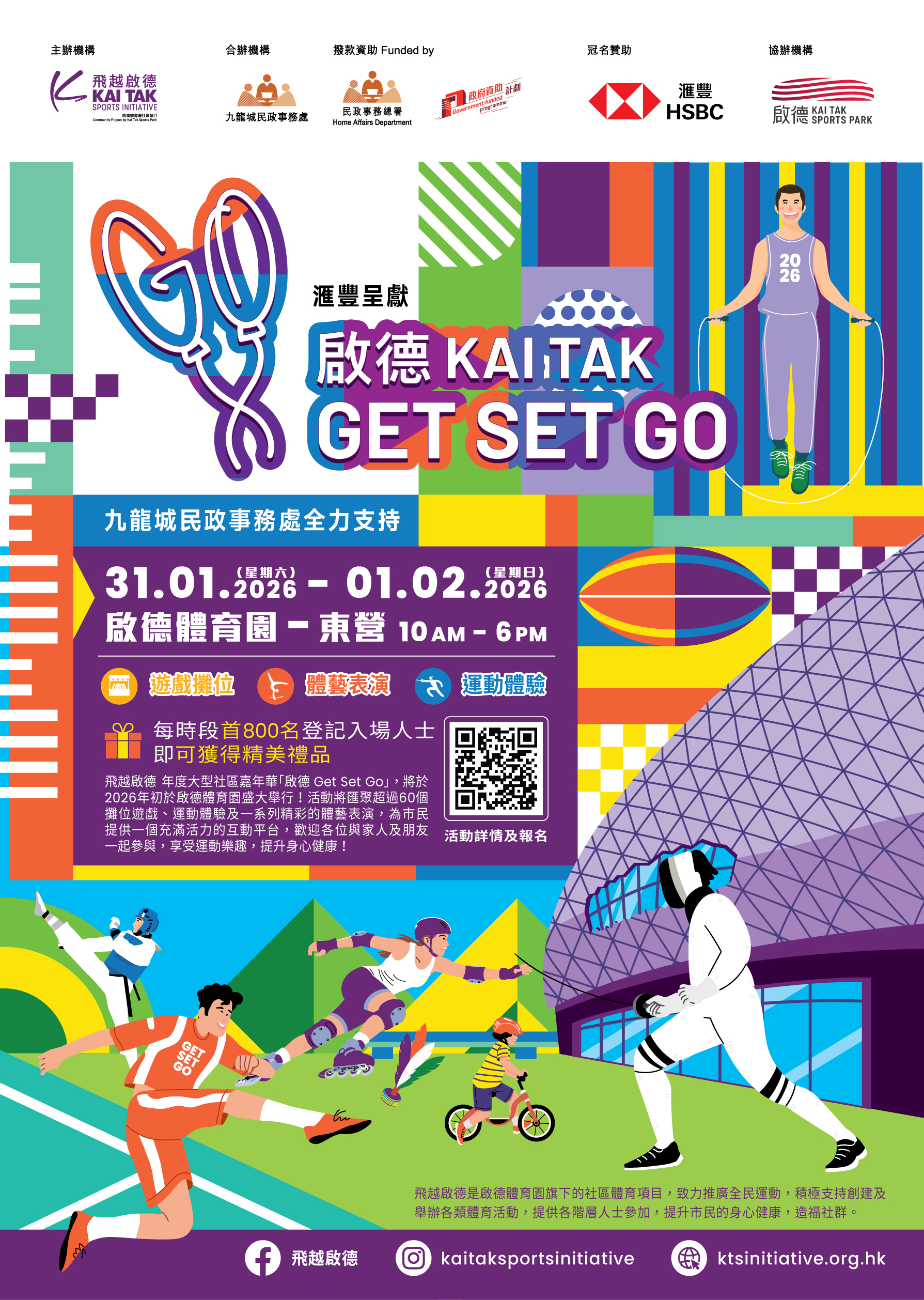 【點新聞報道】大型社區嘉年華「啟德GET SET GO」將於明年1月31日及2月1日於啟體育園登場!活動將匯聚超過60個攤位遊戲、運動體驗及一系列精彩的體藝表演,並邀請多位星級運動員及教練親臨現場,帶領市民親身體驗多種運動項目。歡迎全港市民參加,一同感受運動的無窮樂趣!